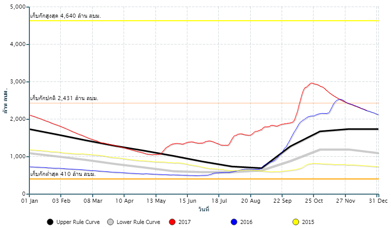 จากรายงานสถานการณ์น้ำในเขื่อนวันที่ 31 ต.ค. 60 โดยกรมชลประทาน มีสถานการณ์น้ำล้นเขื่อนจำนวน 6 แห่ง ได้แก่ เขื่อนกิ่วคอหมา เขื่อนแควน้อย เขื่อนอุบลรัตน์ เขื่อนจุฬาภรณ์ เขื่อนกระเสียว เขื่อนทับเสลา และมีเขื่อนที่มีปริมาณน้ำกักเก็บเกิน 80% ของความจุ ทั้งหมด 16 แห่ง ได้แก่ เขื่อนสิริกิติ์ เขื่อนแม่งัด เขื่อนกิ่วลม เขื่อนลำปาว เขื่อนลำพระเพลิง เขื่อนน้ำอูน เขื่อนสิรินธร เขื่อนห้วยหลวง เขื่อนน้ำพุง เขื่อนป่าสัก เขื่อนศรีนครินทร์ เขื่อนวชิราลงกรณ เขื่อนบางพระ เขื่อนหนองปลาไหล เขื่อนขุนด่าน และเขื่อนประแสร์ โดยเฉพาะเขื่อนอุบลรัตน์ จังหวัดขอนแก่น ที่มีปริมาณน้ำกักเก็บค่อนข้างมากมากตั้งแต่ต้นปี โดยปริมาณน้ำเริ่มมากกว่าเกณฑ์บริหารจัดการน้ำตัวบน ตั้งแต่วันที่ 18 พ.ค. 60 หลังจากนั้นปริมาณน้ำได้เพิ่มขึ้นอย่างช้า ๆ มาอย่างต่อเนื่อง จนถึงช่วงต้นเดือนตุลาคมที่เกิดสถานการณ์ฝนฝนตกหนักในพื้นที่รับน้ำเหนือเขื่อน ส่งผลให้มีปริมาณน้ำไหลลงเขื่อนค่อนข้างมาก โดยมีปริมาณน้ำไหลลงสูงสุด 140.88 ล้านลูกบาศก์เมตร ในวันที่ 9 ต.ค. 60 ทำให้ปริมาณน้ำในเขื่อนเพิ่มขึ้นอย่างรวดเร็ว จนเกินระดับกักเก็บปกติในวันที่ 10 ต.ค. 60