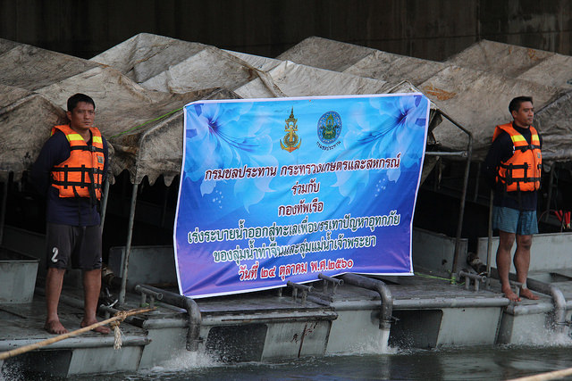 (ภาพข่าว) พล.ร.อ. นริศ ประทุมสุวรรณ ผู้บัญชาการทหารเรือ ในฐานะผู้บัญชาการศูนย์บรรเทาสาธารณภัยกองทัพเรือ พร้อมด้วยเจ้ากรมอู่ทหารเรือ อธิบดีกรมชลประทาน และคณะได้เดินทางไปตรวจการดำเนินการผลักดันน้ำของกองทัพเรือในแม่น้ำท่าจีนของพื้นที่จังหวัดสมุทรสาคร เมื่อ 24 ต.ค. 2560 โดยมี นายประภัสสร์ มาลากาญจน์ ผู้ว่าราชการจังหวัดสมุทรสาคร พร้อมส่วนราชการให้การต้อนรับ (ที่มา: สำนักงานประชาสัมพันธ์จังหวัดสมุทรสาคร)