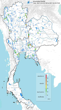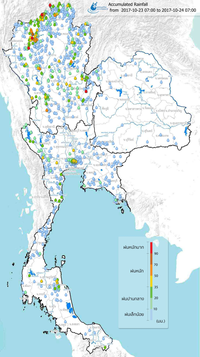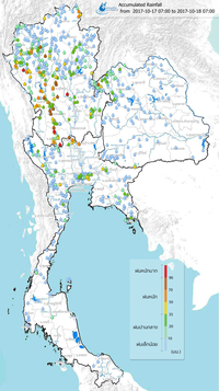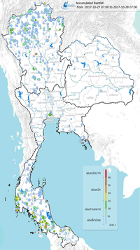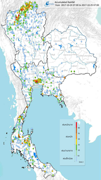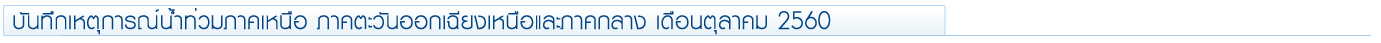 ฝ่ายประมวลวิเคราะห์และสถานการณ์น้ำ กรมชลประทาน กระทรวงเกษตรและสหกรณ์ เผยแพร่เอกสารสถานการณ์น้ำประจำวันที่ 25 ตุลาคม 2560 ตอนหนึ่งมีรายละเอียดเกี่ยวกับสถานการณ์น้ำท่วมและน้ำล้นตลิ่งทั่วประเทศดังนี้