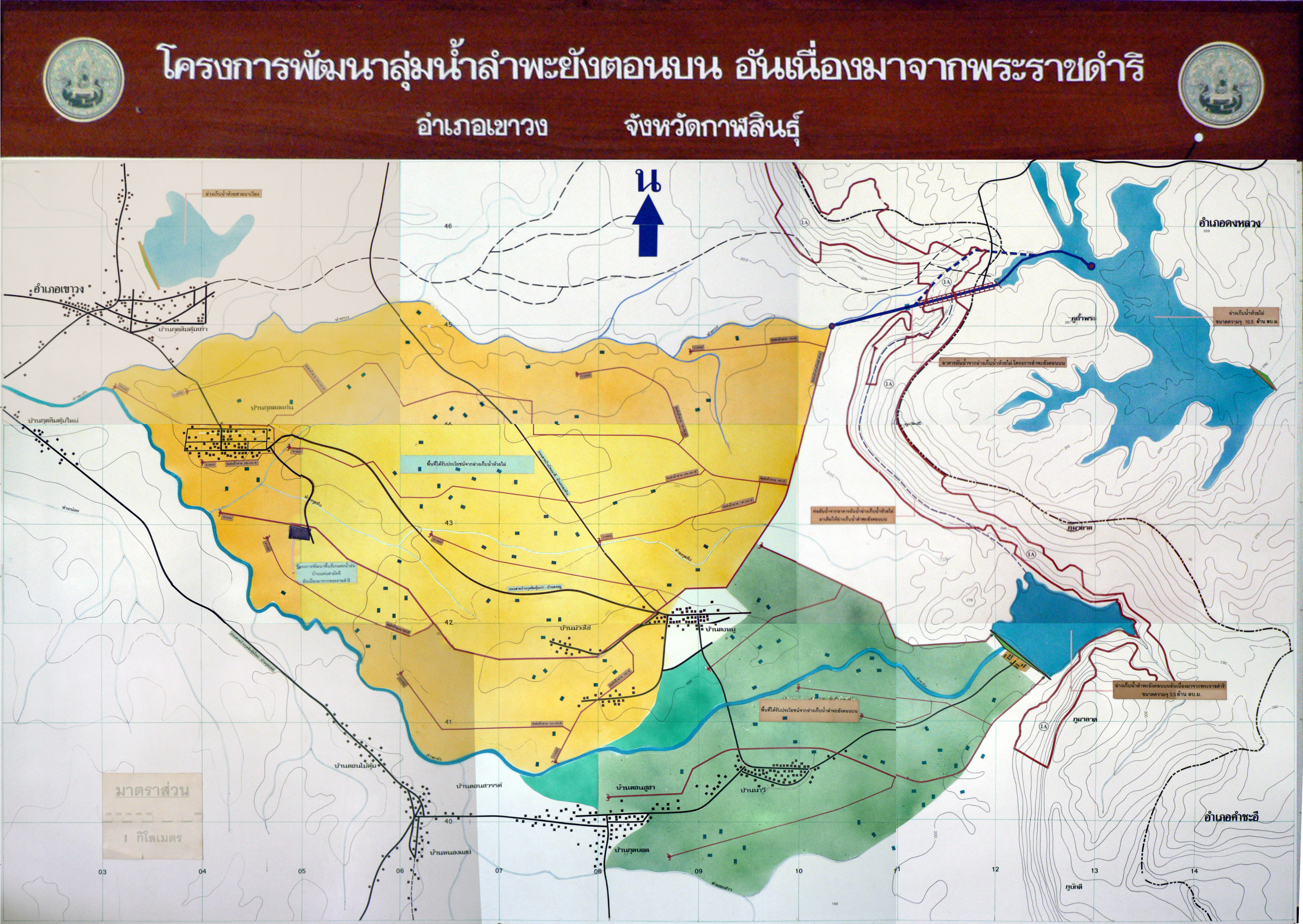การสำรวจพื้นที่โครงการพัฒนา พื้นที่ลุ่มน้ำลำพะยังตอนบน พื้นที่ลุ่มน้ำห้วยบางทราย เป็นพื้นที่สูงทางด้านทิศตะวันตกลาดแทมาทางทิศตะวันออกจรดแม่น้ำโขง พื้นที่ทางด้านทิศตะวันตกและทิศเหนือเป็นภูเขา พื้นที่ทิศตะวันตกตอนล่างเป็นที่ราบสูงแทรกอยู่ระหว่างหุบเขาและปกคลุมด้วยป่า ส่วนทางด้านทิศตะวันออกมีพื้นที่ราบลุ่มสลับเป็นบางแห่ง เป็นที่ตั้งของอ่างเก็บน้ำห้วยไผ่ ที่สามารถจ่ายน้ำให้พื้นที่ชลประทานได้ 1,600 ไร่ และให้น้ำกับพื้นที่ลุ่มน้ำลำพะยังผ่านระบบอุโมงค์ผันน้ำด้วย พื้นที่ลุ่มน้ำลำพะยัง เป็นสาขาตอนบนของแม่น้ำยัง มีต้นกำเนิดจากเทือกเขาภูพานบริเวณภูผาลาด ภูพระ และภูบักดี ตามแนวเขตรอยต่อ อ.เขาวง จ.กาฬสินธุ์ และ อ.ดงหลวง จ.มุกดาหาร น้ำลำพะยังจะไหลจากทิศตะวันออกไปทิศตะวันตกลงสู่แม่น้ำชี สภาพภูมิประเทศมีเทือกเขาล้อมรอบทั้ง 4 ทิศ ภายในเป็นที่ราบแอ่งกระทะ เป็นที่ตั้งของอ่างเก็บน้ำลำพะยังตอนบน ที่สามารถจ่ายน้ำให้พื้นที่ชลประทานได้ 4,600 ไร่ และเป็นที่ตั้งของโครงการอุโมงค์ผันน้ำจากอ่างเก็บน้ำห้วยไผ่ รวมถึงโครงการพัฒนาอื่น ๆ อันมีรายละเอียด กล่าวคือ 1. การใช้ประโยชน์ที่ดินพื้นที่ลุ่มน้ำห้วยบางทราย ด้านทิศตะวันตก เนื่องจากพื้นที่บางส่วนเป็นที่ราบสูงแทรกระหว่างหุบเขา พืชที่ปลูกจึงได้แก่ มันสำปะหลัง อ้อย และยางพารา พื้นที่ลุ่มน้ำลำพะยัง พื้นที่ล้อมรอบด้วยภูเขาทั้ง 4 ทิศ พื้นที่ภายในเป็นที่ราบแอ่งกระทะ พืชที่ปลูกส่วนใหญ่จึงเป็นข้าว และปลูกด้วยวิธีดำนา 2. อ่างเก็บน้ำในพื้นที่โครงการฯ 3 อ่าง อ่างเก็บน้ำห้วยไผ่ อยู่ในลุ่มน้ำห้วยบางทรายตอนบน มีความจุโดยประมาณ 10.5 ล้าน ลบ.ม. สามารถส่งน้ำให้พื้นที่ชลประทานได้ 1 , 600 ไร่ ด้วยระบบท่อส่งน้ำ และเป็นแหล่งจ่ายน้ำผ่านระบบอุโมงค์ผันน้ำให้กับพื้นที่ลุ่มน้ำลำพะยัง อ่างเก็บน้ำลำพะยังตอนบน อยู่ในลุ่มน้ำลำพะยังตอนบน มีความจุโดยประมาณ 4 ล้าน ลบ.ม. ส่งน้ำให้พื้นที่ชลประทานได้ 4,600 ไร่ ด้วยระบบท่อส่งน้ำ อ่างเก็บน้ำห้วยสายนาเวียง อยู่ในลุ่มน้ำลำพะยังตอนบน มีความจุโดยประมาณ 0.94 ล้าน ลบ.ม. ส่งน้ำให้พื้นที่ชลประทานได้ 600 ไร่ และเพื่อการอุปโภค บริโภค 3. โครงการอุโมงค์ผันน้ำจากอ่างเก็บน้ำห้วยไผ่ เริ่มจากระบบชักน้ำอ่างเก็บน้ำห้วยไผ่ เป็นคลองดิน และท่อ HDPE รวมระยะ 850 ม. อุโมงค์ผันน้ำลอดใต้เขาภูบักดี ระยะ 740 ม. มีระดับปากอุโมงค์ฝั่งอ่างเก็บน้ำห้วยไผ่ และระดับปากอุโมงค์ฝั่งลุ่มน้ำลำพะยังมีความแตกต่างที่ระดับ 77 ม. แทงค์น้ำ ที่กระจายน้ำให้พื้นที่รับประโยชน์จากอุโมงค์ผันน้ำ 7,900 ไร่ 