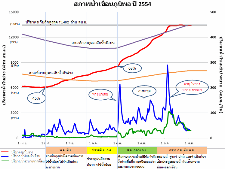 ปี 2554 เขื่อนขนาดใหญ่ทั้ง 33 แห่งทั่วประเทศ มีปริมาณน้ำไหลลงเขื่อนสะสมรวมกันทั้งปี 71,769 ล้านลูกบาศก์เมตร ซึ่งถือเป็นปริมาณน้ำไหลลงเขื่อนที่มากเป็นประวัติการณ์ โดยมีการระบายน้ำออกไปถึง 56,241 ล้านลูกบาศก์เมตร ซึ่งมากเป็นประวัติการณ์เช่นกัน แต่ถึงแม้จะระบายน้ำออกไปมาก ปริมาณน้ำกักเก็บคงเหลือ ณ วันสิ้นปี กลับยังคงมีเหลืออยู่ถึง 61,097 ล้านลูกบาศก์เมตร คิดเป็น 87% ของความจุเขื่อน ซึ่งอยู่ในเกณฑ์น้ำมาก โดยเป็นปริมาณน้ำใช้การได้จริง 37,591 ล้านลูกบาศก์เมตร