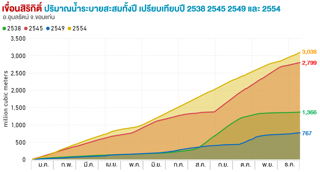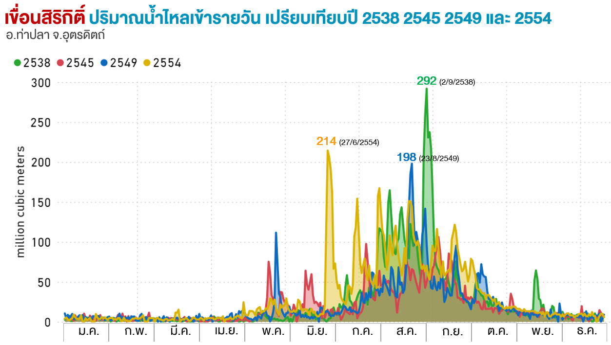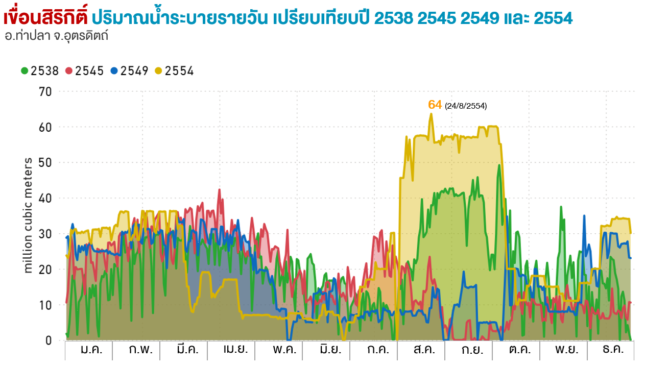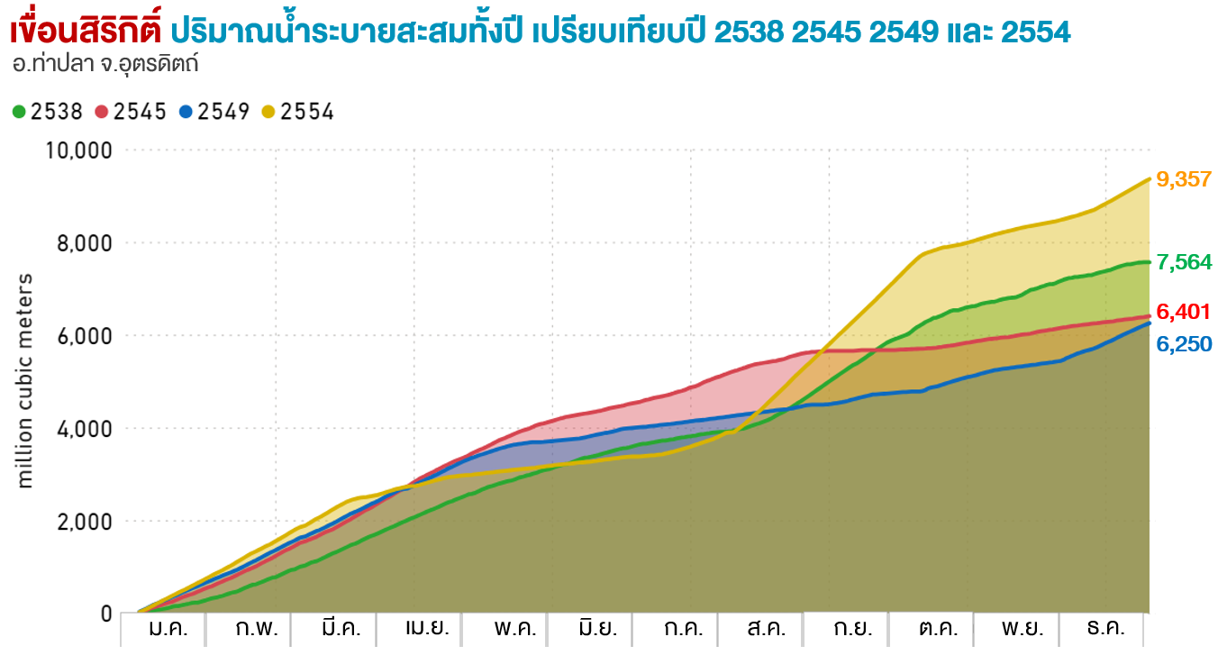 spillway รวมทั้งสิ้น 342.48 ล้านลูกบาศก์เมตร ส่วนเขื่อนสิริกิติ์ เปิด spillway เพื่อระบายน้ำในช่วงวันที่ 25 สิงหาคม 2554 ถึงวันที่ 11 กันยายน 2554 รวมทั้งหมด 18 วัน ปริมาณน้ำระบาย spillway รวมทั้งสิ้น 183.84 ล้านลูกบาศก์เมตร