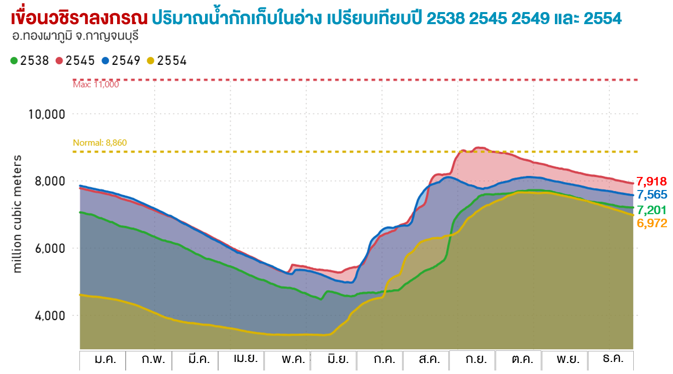 เร่งระบายน้ำออกไปมาก จึงทำให้ปริมาณกักเก็บคงเหลือลดลงอยู่ในเกณฑ์น้ำน้อยในช่วงสิ้นปี ต่างจากเขื่อนปราณบุรี จ.ประจวบคีรีขันธ์ ซึ่งเป็นอีกหนึ่งเขื่อนที่มีน้ำกักเก็บคงเหลือสิ้นปีอยู่ในเกณฑ์น้อย อาจถือได้ว่าเขื่อนนี้เป็นเขื่อนเดียวในประเทศที่ในปี 2554 มีน้ำไหลลงเขื่อนค่อนข้างน้อย โดยตลอดทั้งปีมีน้ำไหลลงเขื่อนเพียง 310 ล้านลูกบาศก์เมตรเท่านั้น ซึ่งถือว่าอยู่ในเกณฑ์น้อยหากเทียบกับข้อมูลในอดีตของเขื่อนนี้ และหากย้อนไปดูแผนที่แสดงปริมาณและการกระจายตัวของฝนของปี 2554 จะพบว่าบริเวณเขื่อนนี้และพื้นที่โดยรอบมีฝนตกค่อนข้างน้อยมากหากเทียบกับพื้นที่อื่น ๆ ของประเทศ อย่างไรก็ตามในปีนี้ไม่มีเขื่อนใดเลยที่มีน้ำกักเก็บคงเหลืออยู่ในเกณฑ์น้อยวิกฤต รายละเอียดเพิ่มเติมดังตารางด้านล่าง