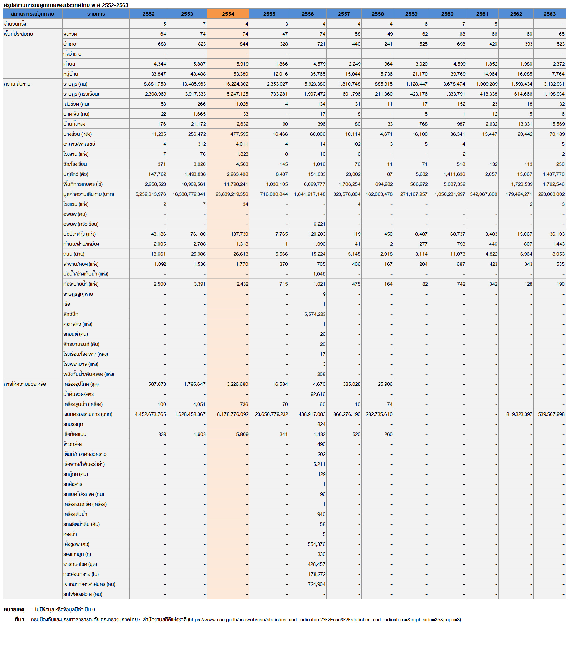 - สรุปสถานการณ์อุทกภัย ตั้งแต่วันที่ 25 กรกฎาคม 2554 จนถึง 30 พฤศจิกายน 2554 มีพื้นที่ที่ได้รับผลกระทบและประกาศเป็นพื้นที่ประสบภัยพิบัติกรณีฉุกเฉิน (อุทกภัย) รวมทั้งสิ้น 65 จังหวัด 684 อำเภอ 4,917 ตำบล 43,600 หมู่บ้าน ได้แก่ จังหวัดเชียงราย เชียงใหม่ แพร่ น่าน แม่ฮ่องสอน ลำปาง ลำพูน อุตรดิตถ์ สุโขทัย พิษณุโลก พิจิตร เพชรบูรณ์ ตาก กำแพงเพชร นครสวรรค์ อุทัยธานี ชัยนาท สิงห์บุรี อ่างทอง พระนครศรีอยุธยา ลพบุรี สระบุรี สุพรรณบุรี ราชบุรี นครปฐม ปทุมธานี นนทบุรี เลย อุดรธานี หนองคาย หนองบัวลำภู บึงกาฬ นครพนม อำนาจเจริญ มุกดาหาร สกลนคร ยโสธร ขอนแก่น กาฬสินธุ์ สุรินทร์ ร้อยเอ็ด มหาสารคาม บุรีรัมย์ ศรีสะเกษ อุบลราชธานี ชัยภูมิ นครราชสีมา นครนายก สระแก้ว ปราจีนบุรี ฉะเชิงเทรา ชลบุรี ระยอง จันทบุรี ตราด ระจวบคีรีขันธ์ สุราษฎร์ธานี ระนอง พังงา ภูเก็ต ตรัง สตูล สมุทรสาคร สมุทรปราการ และกรุงเทพมหานคร ราษฎรได้รับความเดือดร้อน 4,039,459 ครัวเรือน 13,425,869 คน บ้านเรือนเสียหายทั้งหลัง 2,329 หลัง