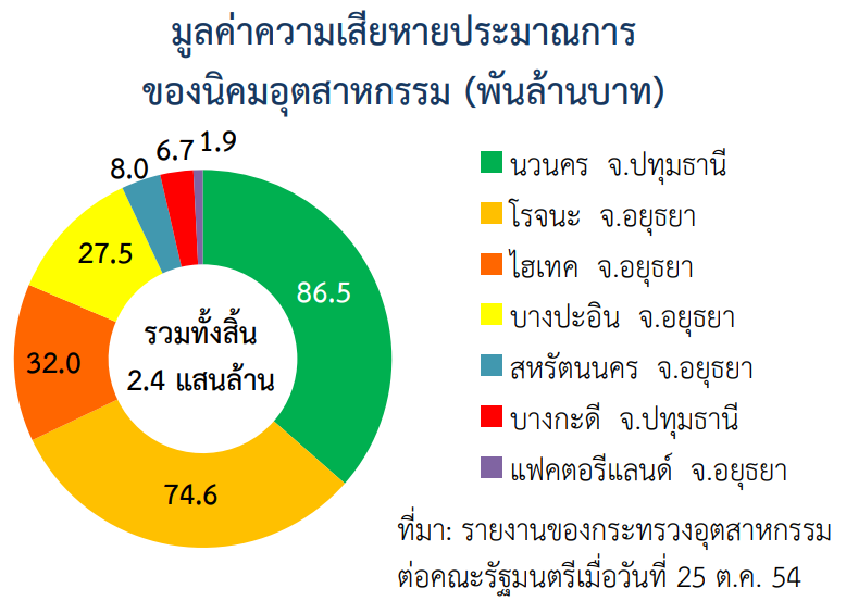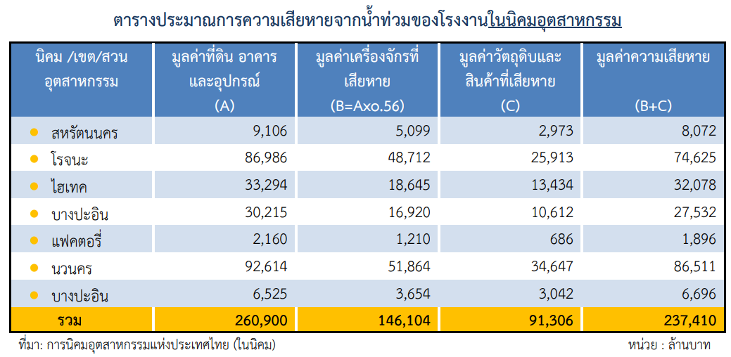 เนื่องจากธนาคารโลกไม่ได้ประเมินเฉพาะความเสียหาย (Damage) จากสิ่งปลูกสร้างถูกทําลาย เช่น บ้านถล่ม ตึกพัง โรงงงานจมน้ำ โบราณสถานน้ำท่วม เท่าน้ัน แตยังประเมินความสญูเสีย (Loss) ด้วย ซึ่งเป็นผลกระทบต่อเนื่อง เช่น โรงงานปิดผลิตสินค้าไม่ได้ คนงานต้องหยุดงาน ทําให้ธุรกิจและแรงงานสูญเสียรายได้ที่ควรจะได้หากน้ำไม่ท่วม เป็นต้น จากการประเมินความเสียหายดังกล่าวปรากฏว่าตัวเลขความ
