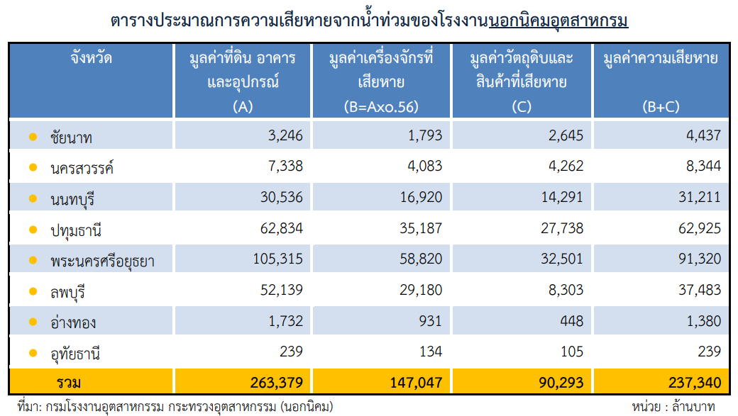การเกษตรคาดว่าจะได้รับความเสียหาย 11.20 ล้านไร่ ถนน 13,961 สาย ท่อระบายน้ำ 777 แห่ง ฝาย 982 แห่ง ทำนบ 142 แห่ง สะพาน/คอสะพาน 724 แห่ง บ่อปลา/บ่อกุ้ง/หอย 231,919 ไร่ ปศุสัตว์ 13.41 ล้านตัว มีผู้เสียชีวิต 657 ราย (44 จังหวัด) สูญหาย 3 คน (จ.แม่ฮ่องสอน 2 ราย จ.อุตรดิตถ์ 1 ราย) ดังนี้ จังหวัดอุดรธานี สกลนคร ตราด อำนาจเจริญ ยโสธร จังหวัดละ 1 คน อ่างทอง 16 คน นครพนม ตาก พังงา ลำปาง นครนายก จังหวัดละ 2 คน สุโขทัย 18 คน ชลบุรี 3 คน ปราจีนบุรี 22 คน สระแก้ว ร้อยเอ็ด สุรินทร์ จังหวัดละ 4 คน ชัยนาท 23 คน อุทัยธานี มหาสารคาม จังหวัดละ 5 คน นครปฐม 2 คน ฉะเชิงเทรา เพชรบูรณ์ ชัยภูมิ จังหวัดละ 6 คน พิษณุโลก 25 คน แม่ฮ่องสอน อุตรดิตถ์ กำแพงเพชร นนทบุรี จังหวัดละ 7 คน สิงห์บุรี 31 คน แพร่ 8 คน สุพรรณบุรี 39 คน อุบลราชธานี 9 คน ลพบุรี 42 คน ขอนแก่น 10 คน พิจิตร 53 คน เชียงใหม่ 13 คน นครสวรรค์ 72 คน ปทุมธานี 14 คน อยุธยา 139 คน สระบุรี 15 คน