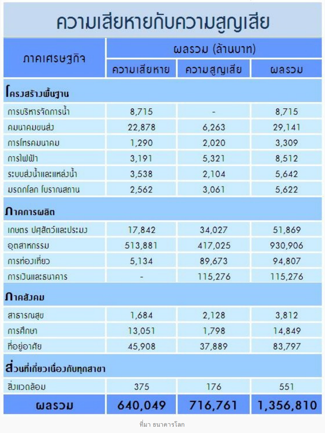 สูญเสียอยู่ 716,761 ล้านบาท สูงกว่าความเสียหายซึ่งอยู่ที่ 640,049 ล้านบาท โดยภาคการเงินมีความสูญเสียมากที่สุด เนื่องจากน้ําท่วมทําให้ธนาคารพาณิชย์สูญเสียโอกาสในการปล่อยสินเชื่อ รองลงมาคือภาคอุตสาหกรรมที่ต้องหยุดการผลิตช่วงน้ำท่วม และภาคการท่องเที่ยว ที่ต้องสูญเสียรายได้เพราะนักท่องเที่ยวลดลง (รายละเอียดดูจากตาราง)