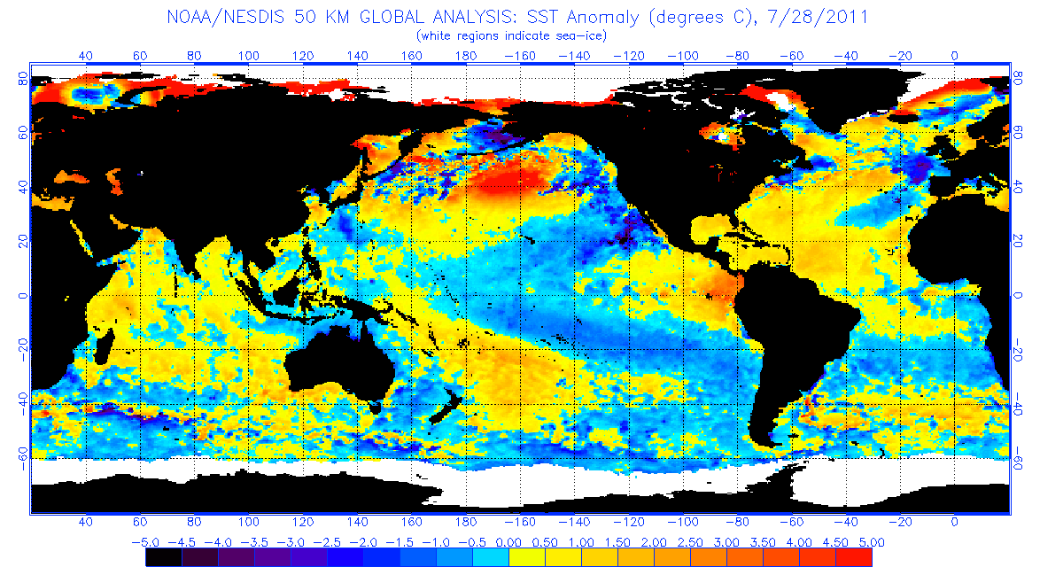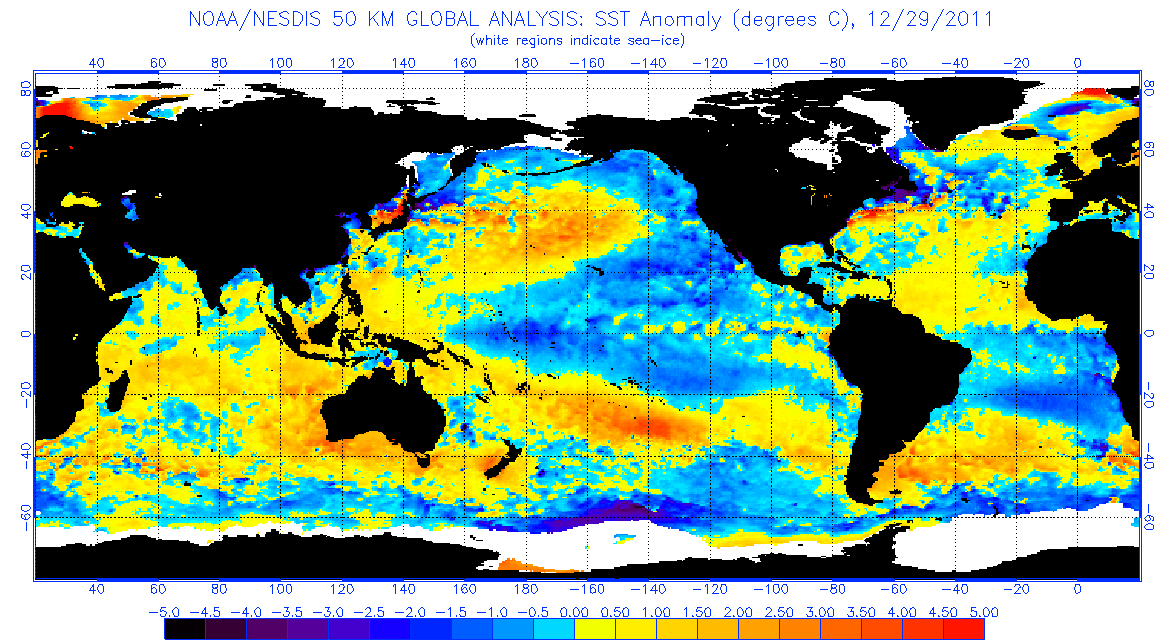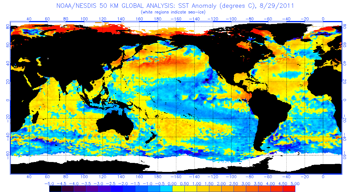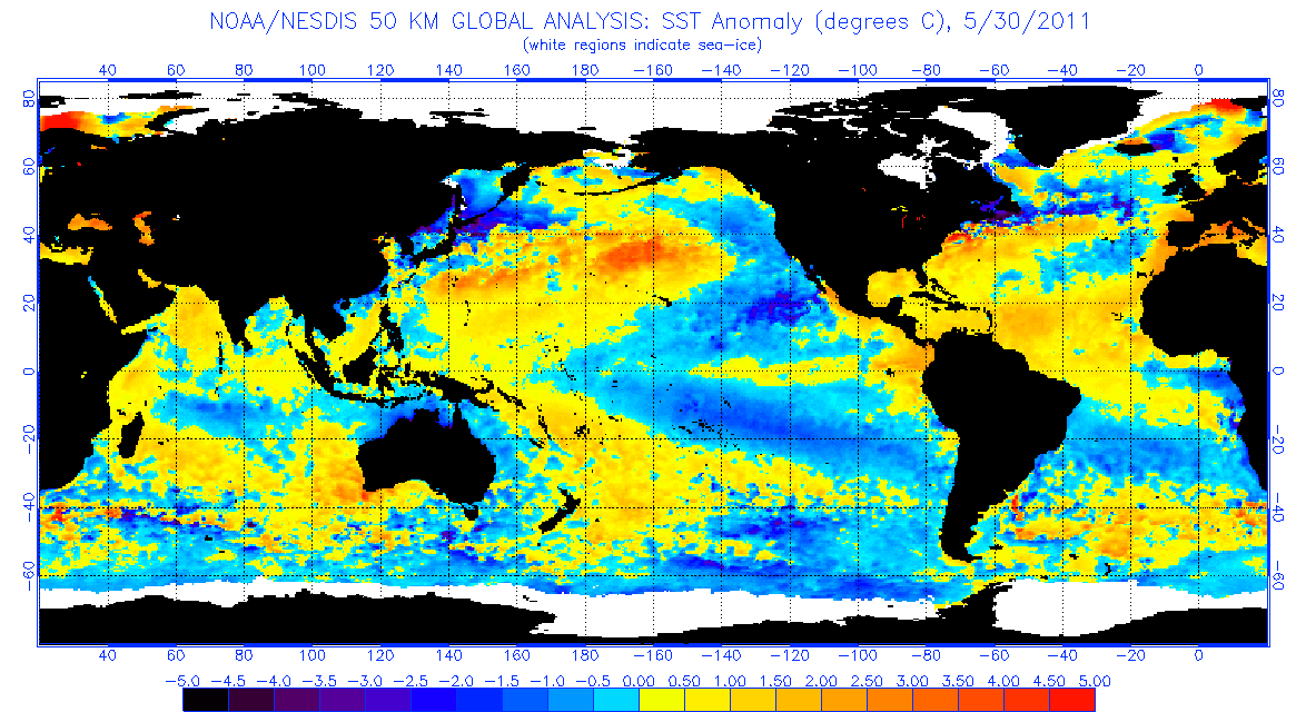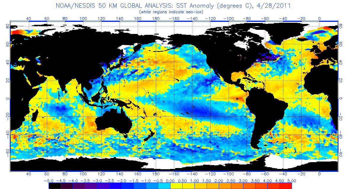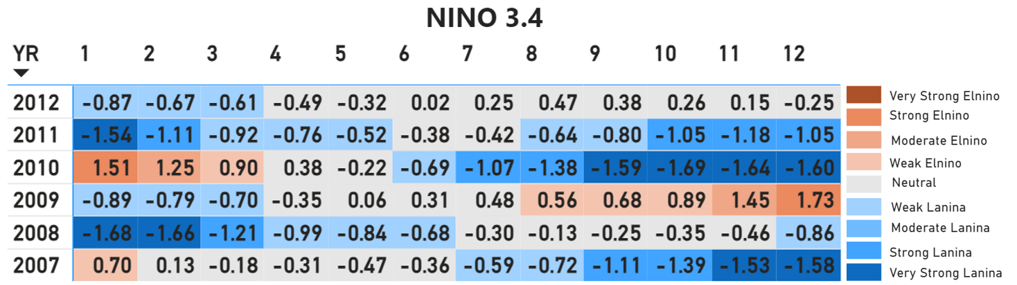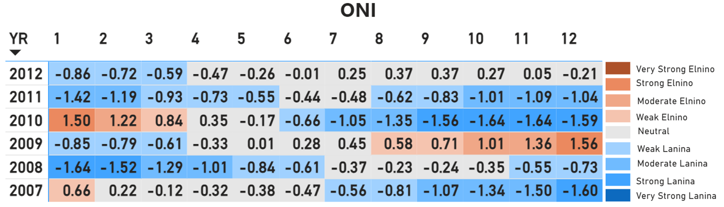ปกติ ทั้งนี้ในช่วงเหตุการณ์ มหาอุทกภัยปี 2554 ปรากฎการณ์ลานีญาได้เริ่มเกิดขึ้นตั้งแต่ช่วงกลางปี 2553 ต่อเนื่องจนถึงกลางปี 2554 โดยมีกำลังแรงในช่วงปลายปี 2553 หลังจากนั้นได้ลดระดับเป็นลานีญากำลังปานกลางและกำลังอ่อนในช่วงต้นปี 2554 จากนั้นได้กลับเข้าสู่สภาวะเป็นกลาง (ดัชนี ONI อยู่ระหว่าง -0.5 ถึง 0.5) ช่วง