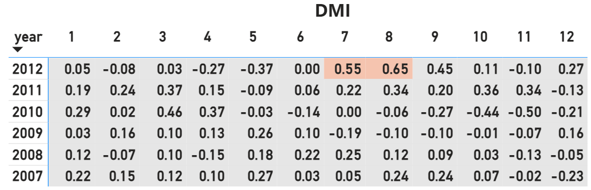 และพื้นที่ใกล้เคียง ซึ่งใช้ค่าดัชนี DMI (Dipole Mode Index) ในการวิเคราะห์การเกิดปรากฎการณ์ กรณีค่าดัชนีน้อยกว่า -0.50 อาจส่งผลทำให้บริเวณประเทศไทยและพื้นที่ใกล้เคียงมีแนวโน้มฝนตกมากกว่า