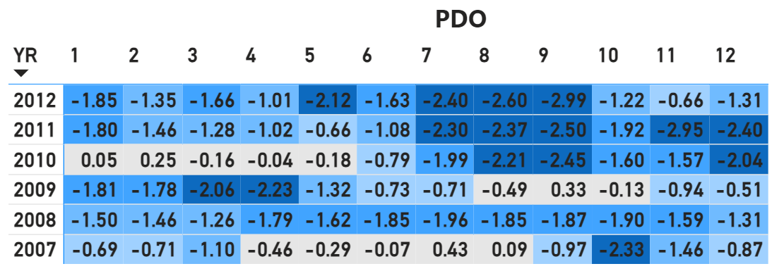 การสลับข้างกันทุก 30 ปีโดยประมาณ โดย กรณีค่าน้อยกว่า -0.5 หมายถึง แนวโน้มประเทศไทยอาจมีฝนตกมาก ซึ่งจากตารางจะพบว่าค่า PDO เริ่มน้อยกว่า -0.5 มาตั้งแต่ช่วงกลางปี 2553 ต่อเนื่องจนถึง