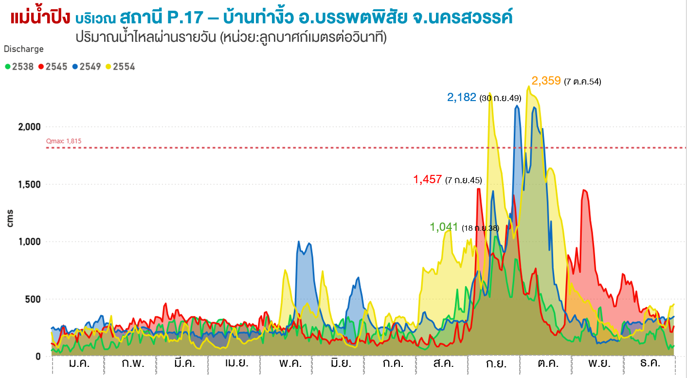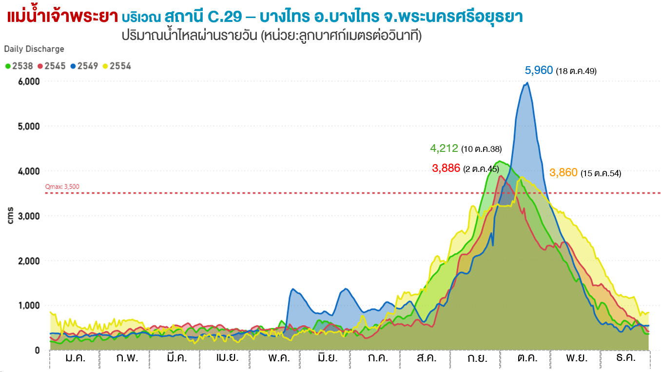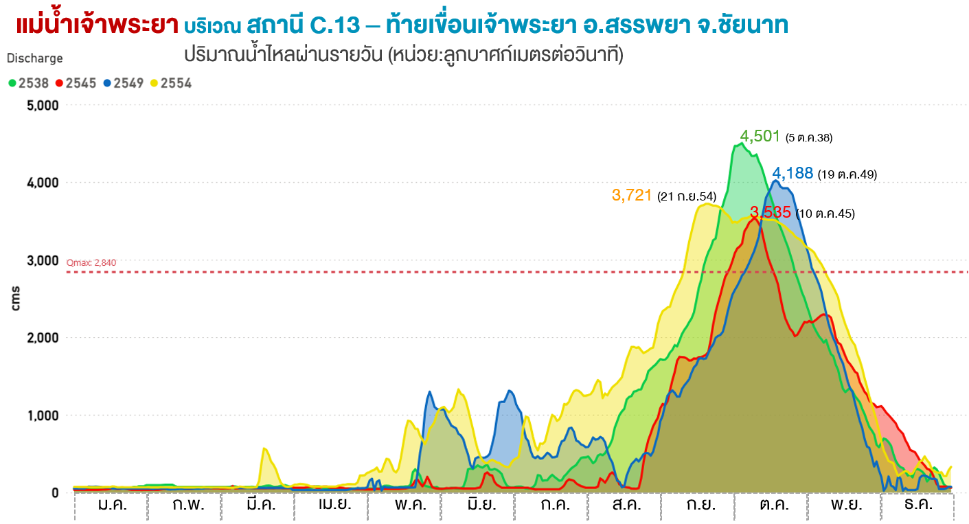 พฤศจิกายน 2554 ส่งผลทำให้มีปริมาณน้ำไหลผ่านรวมทั้งปีสูงถึง 35,400 ซึ่งมากกว่าปี 2538 2545 2549 ที่เกิดอุทกภัยร้ายแรงครั้งใหญ่ในลุ่มน้ำเจ้าพระยา