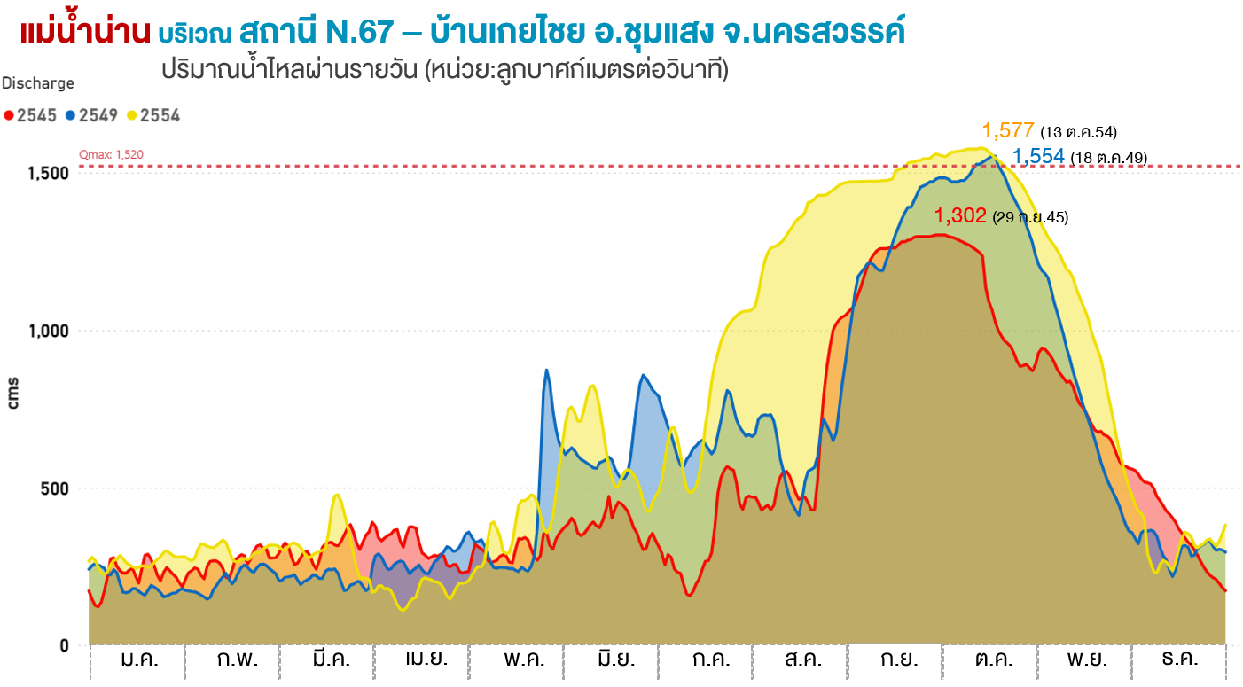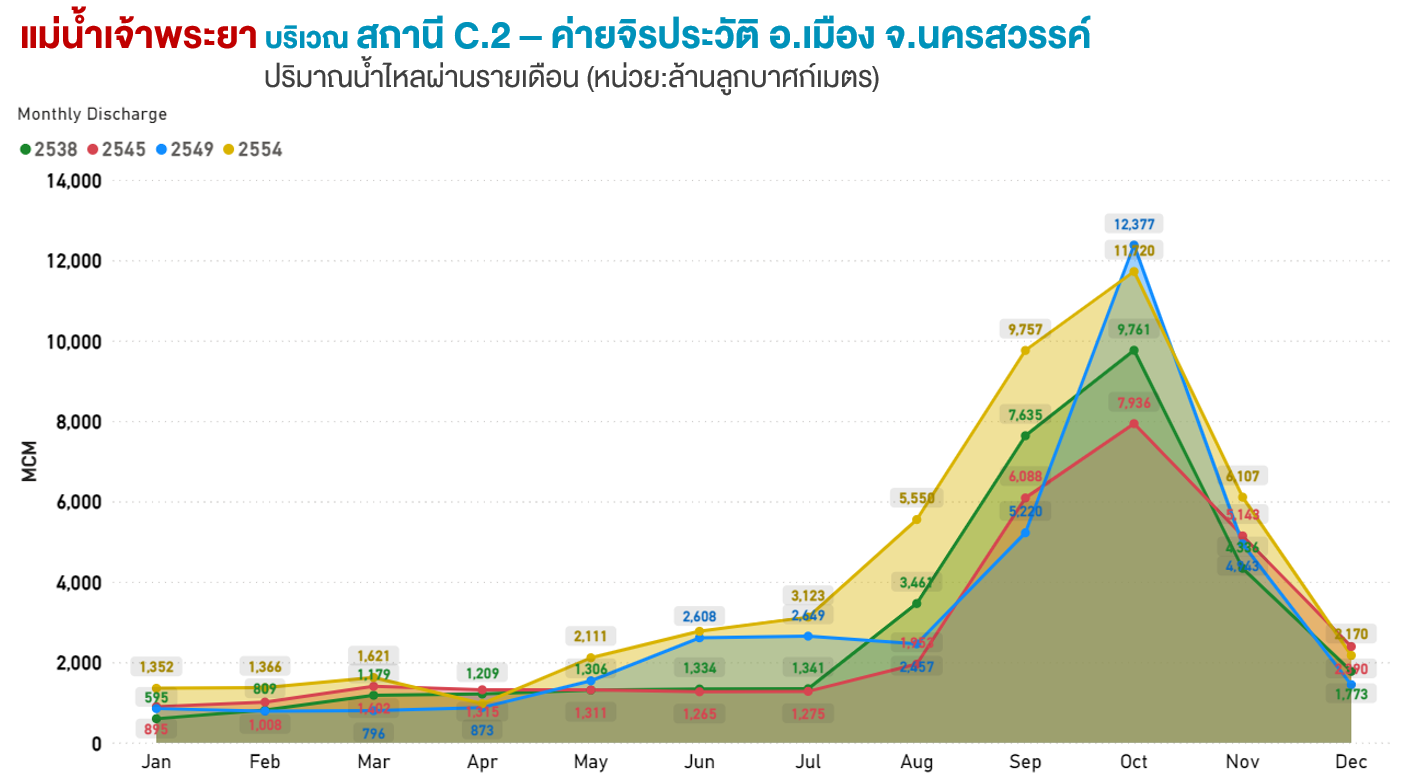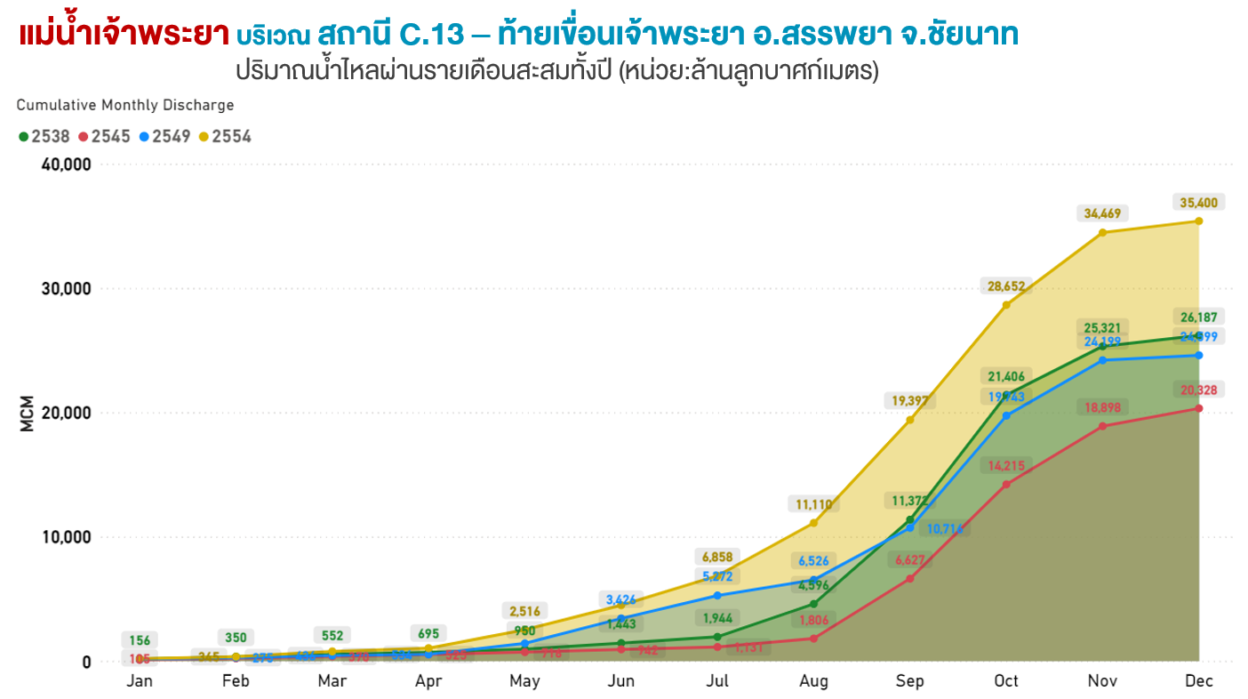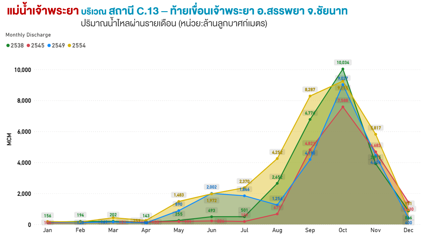 ได้ชัด ทำให้มีปริมาณน้ำสะสมทั้งปีสูงถึง 15,586 ล้านลูกบาศก์เมตร ซึ่งมากที่สุดเมื่อเทียบกับปี 2538 3545 และ 2549 ที่ลุ่มน้ำเจ้าพระยาเกิดอุทกภัยรุนแรง