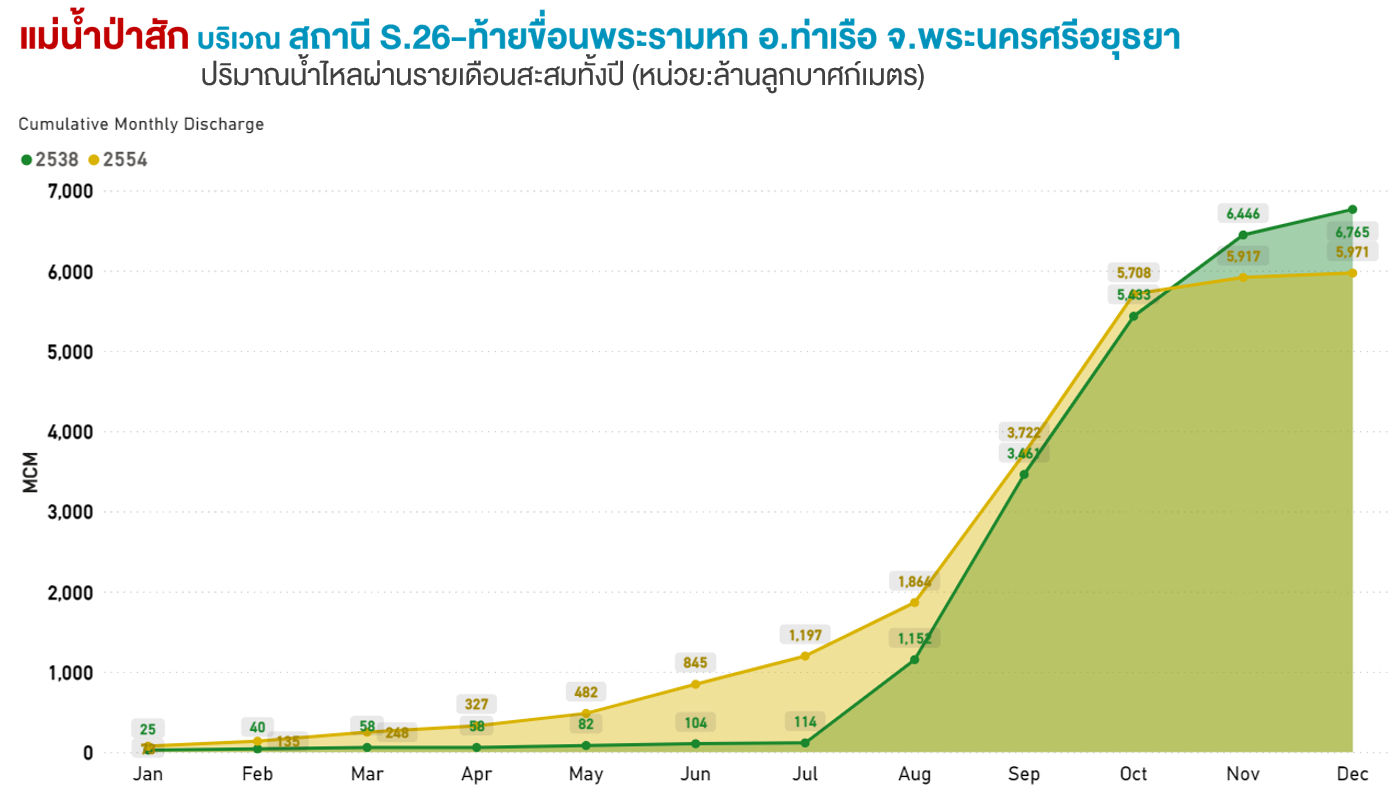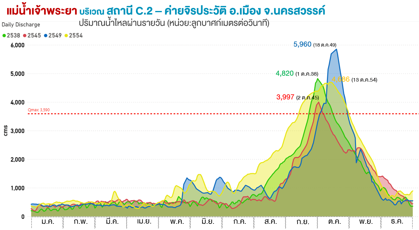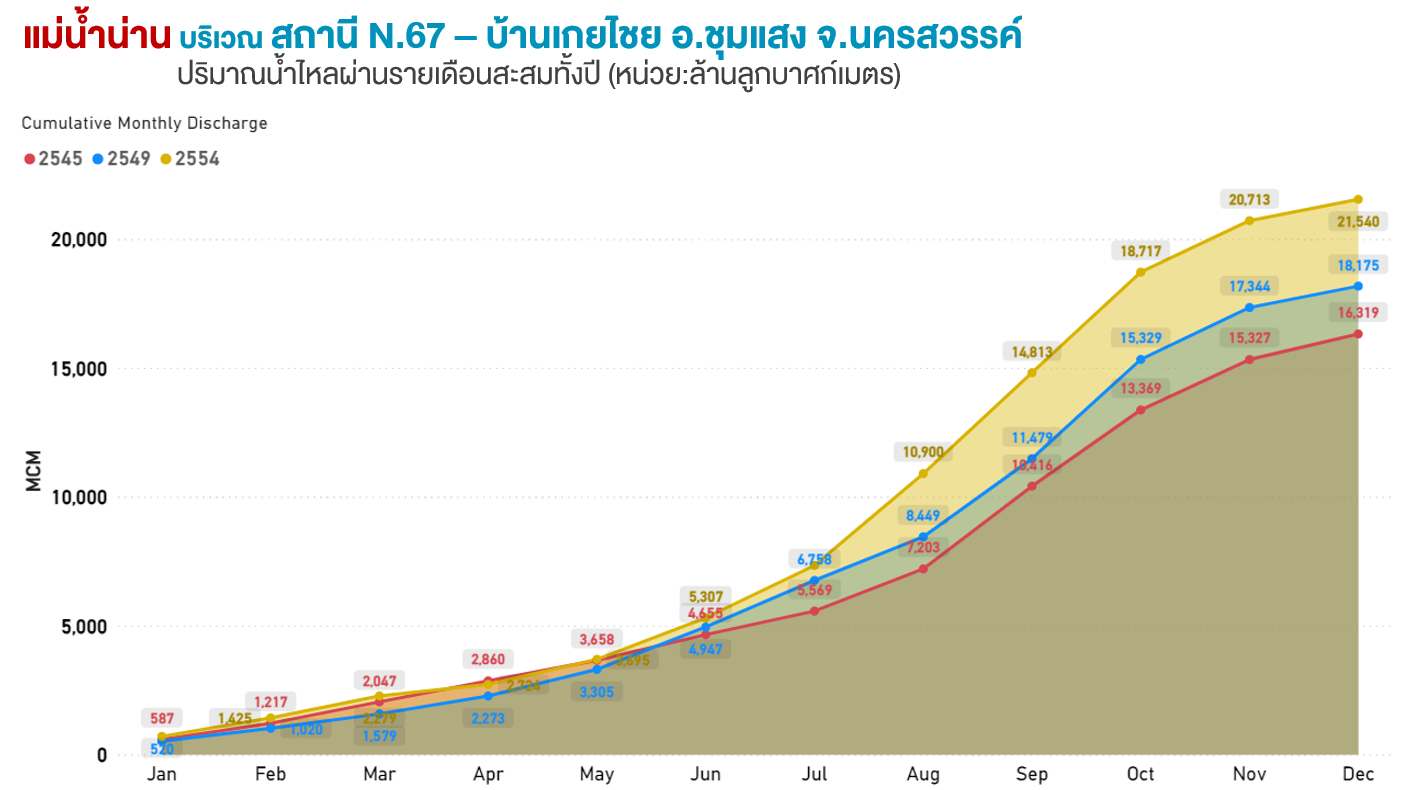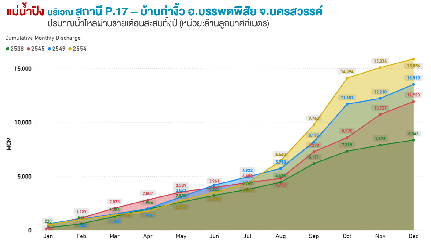 ได้ชัด ทำให้มีปริมาณน้ำสะสมทั้งปีสูงถึง 15,586 ล้านลูกบาศก์เมตร ซึ่งมากที่สุดเมื่อเทียบกับปี 2538 3545 และ 2549 ที่ลุ่มน้ำเจ้าพระยาเกิดอุทกภัยรุนแรง