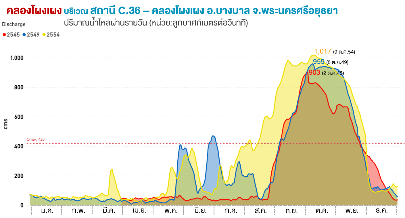 ที่ไหลลงมาจากภาคเหนือส่งผลทำให้เกิดน้ำไหลบ่าหลากเข้าท่วมจนไม่สามารถคำนวณปริมาณน้ำได้จากตัวเลขระดับน้ำ โดยเฉพาะช่วงวันที่ 26 ตุลาคม – 2 พฤศจิกายน 2554 เนื่องจากเกิดการล้นตลิ่งออกไป