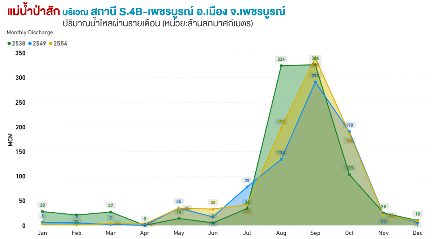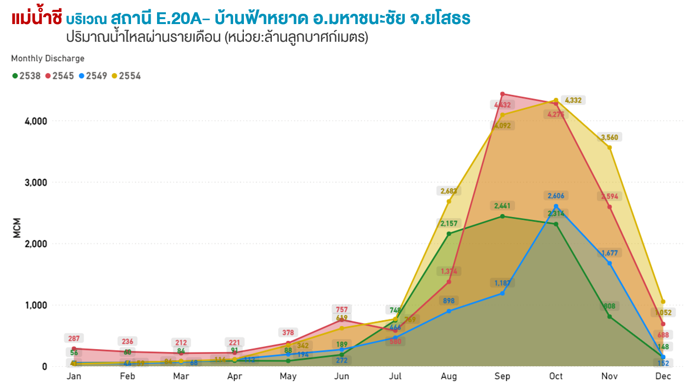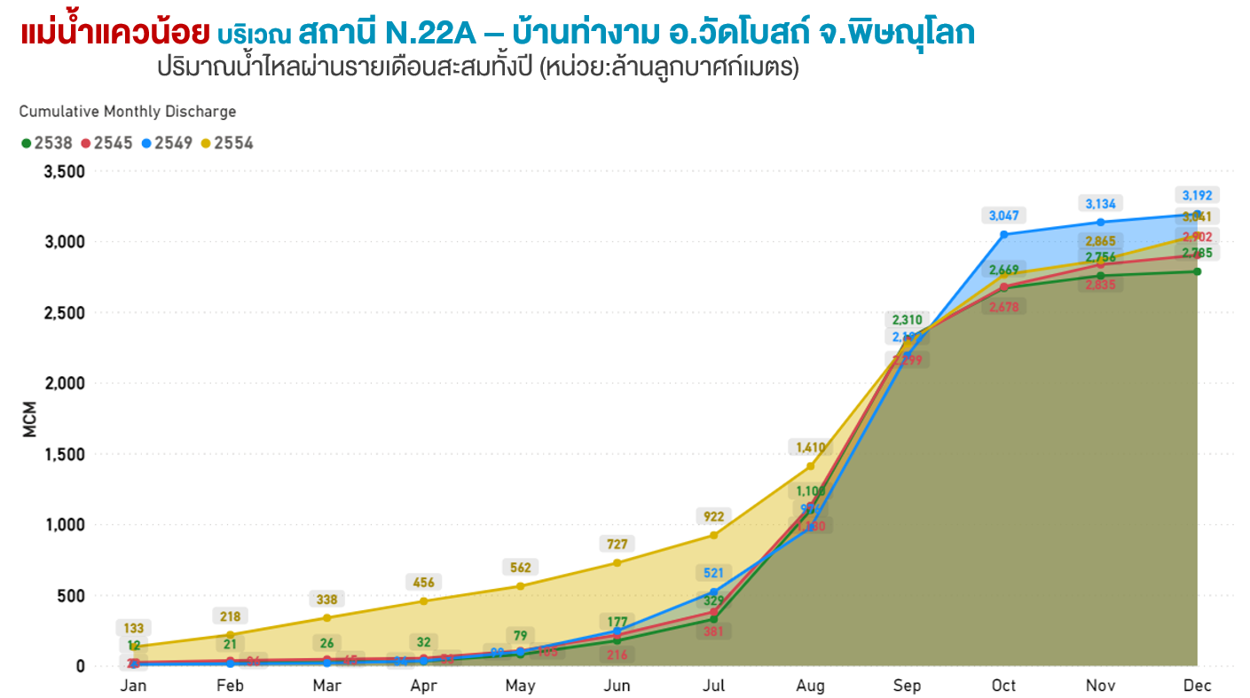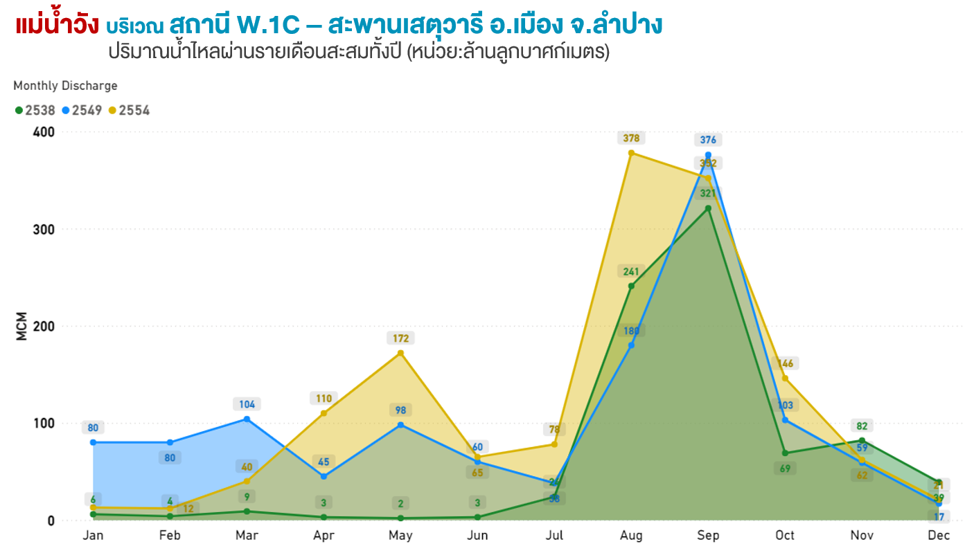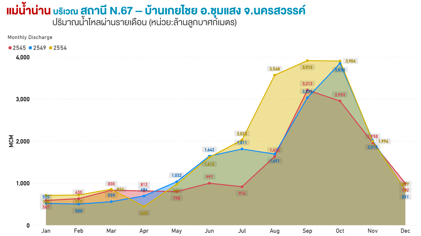 พฤษภาคม และมีปริมาณน้ำสูงสุดในเดือนสิงหาคม ปริมาณน้ำรวมทั้งปี 4,156 ล้านลูกบาศก์เมตร มากกว่าปี 2538 2545 และ 2549