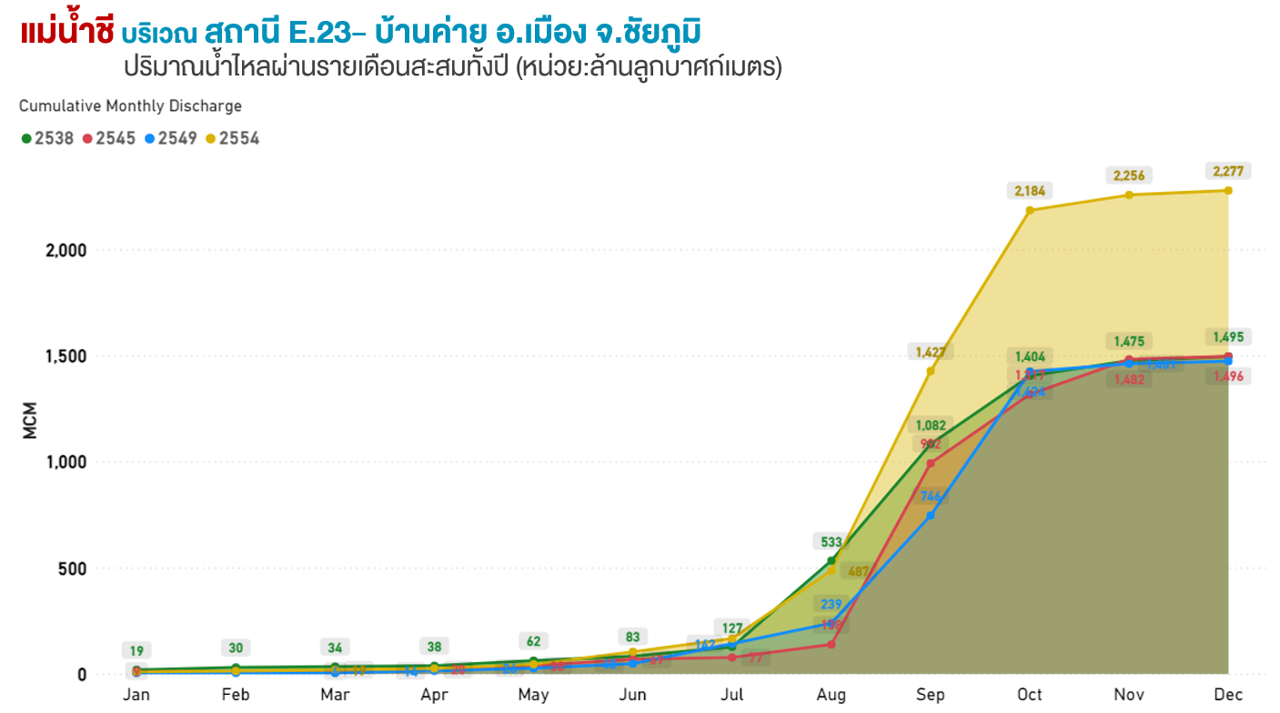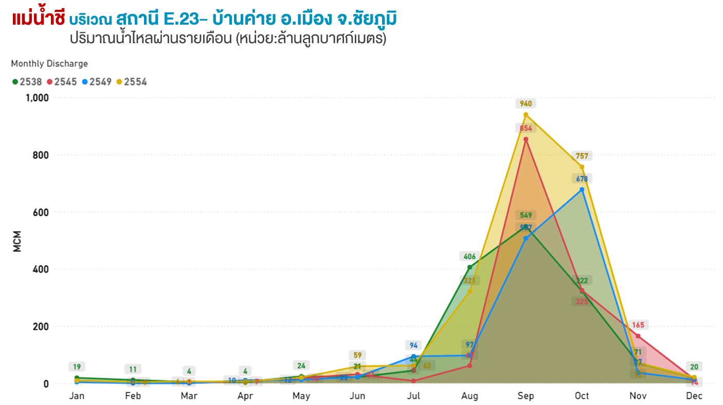 ในปี 2554 บริเวณต้นแม่น้ำชีที่สถานี E.23 บ้านค่าย อ.เมือง จ.ชัยภูมิ ปริมาณน้ำค่อนข้างมากในช่วงเดือนสิงหาคมถึงตุลาคม โดยมีปริมาณน้ำรวมทั้งปี 2,277 ล้านลูกบาศก์เมตร มากกว่าปี 2538 2545