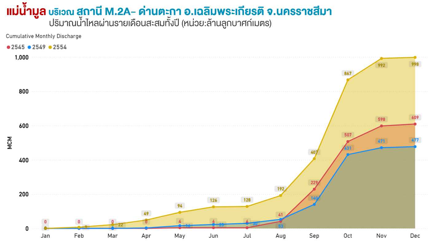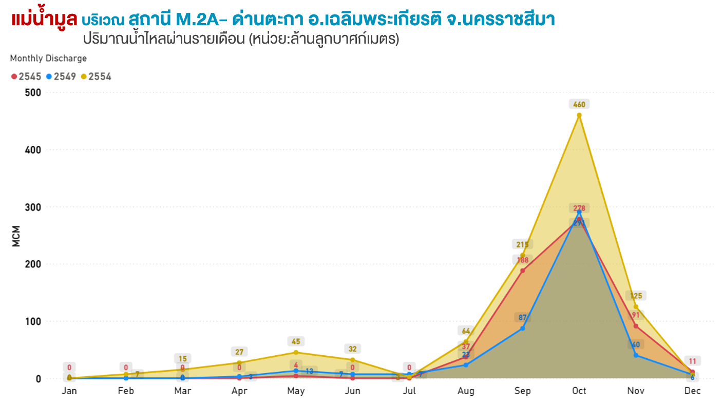 ปี 2554 บริเวณต้นแม่น้ำมูลที่สถานี M.2A ด่านตะกะ อ.เฉลิมพระเกียรติ จ.นครราชสีมา มีปริมาณน้ำมากกว่าปี 2545 และ 2549 มาตั้งแต่ต้นปี และเพิ่มขึ้นมากอย่างเห็นได้ชัดในเดือนสิงหาคม กันยายนและตุลาคม ปริมาณน้ำรวมทั้งปี 998 ล้านลูกบาศก์เมตร มากกว่าปี 2545