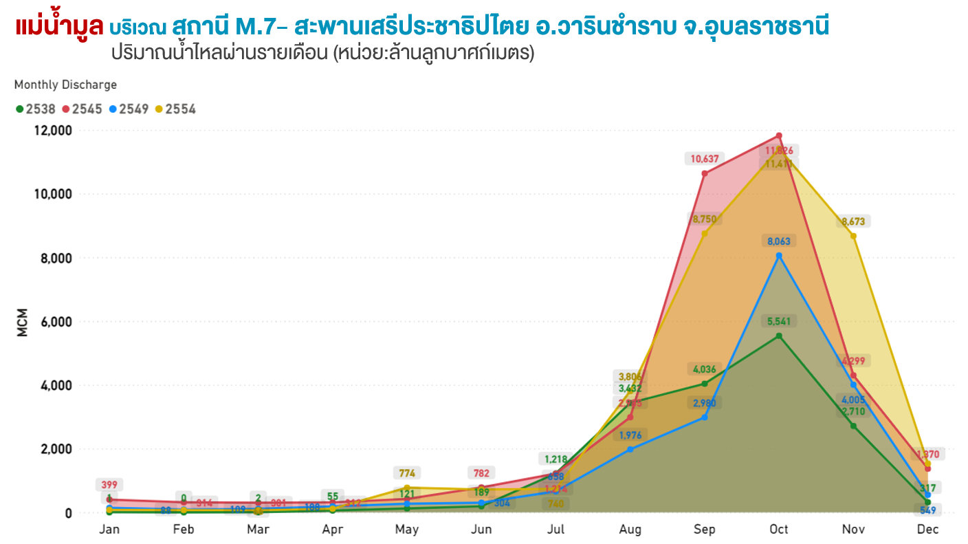 และ 2549 ค่อนข้างมาก ส่วนบริเวณท้ายน้ำ ที่สถานี M.7 สะพานเสรีประชาธิปไตย อ.วารินชำราบ จ.อุบลราชธานี ซึ่งเป็นจุดตรวจวัดหลังจากน้ำในแม่น้ำชีไหลลงมารวมกันน้ำของแม่น้ำมูล ซึ่งในปี 2554 ปริมาณน้ำเพิ่มขึ้นมากในช่วงเดือนกันยายนและตุลาคม แต่น้อยกว่าปี 2545 แต่เมื่อเข้าสู่