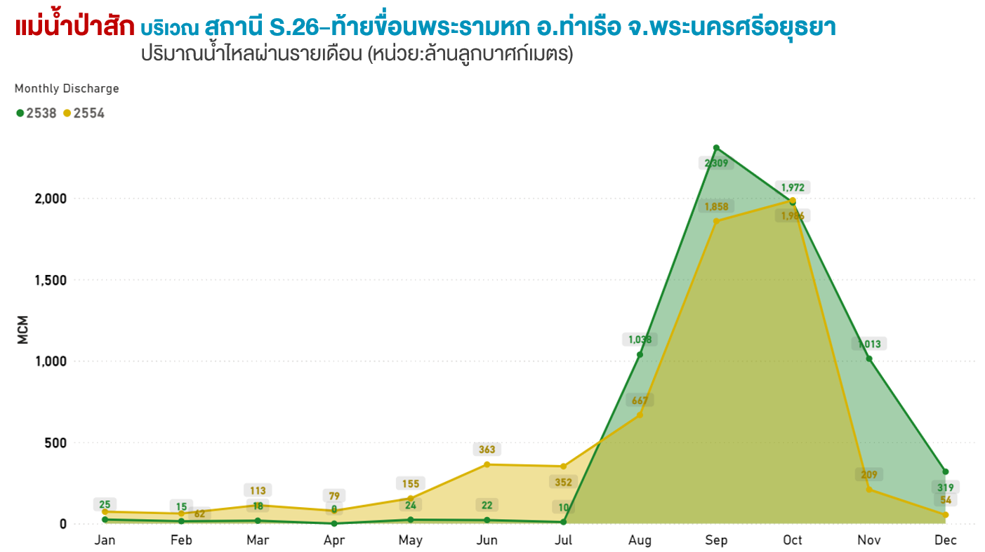 แต่มากกว่าปี 2549 ส่วนท้ายแม่น้ำป่าสักบริเวณเขื่อนพระรามหก อ.ท่าเรือ จ.พระนครศรีอยุธยา ปริมาณน้ำมากกว่าปี 2538 มาตั้งแต่ต้นปี และเพิ่มขึ้นมากใน
