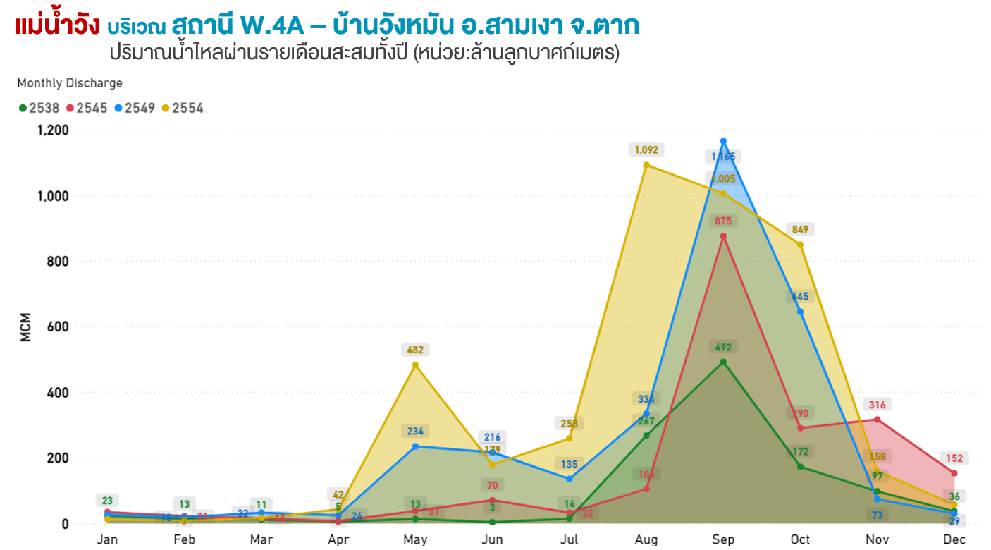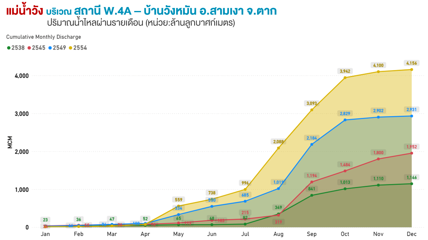 ลูกบาศก์เมตร มากกว่าปี 2538 และ 2549 ส่วนบริเวณท้ายน้ำก่อนบรรจบกับแม่น้ำปิง ที่สถานี W.4A บ้านวังหมัน อ.สามเงา จ.ตาก ตรวจวัดน้ำได้ค่อนข้างมากในเดือน