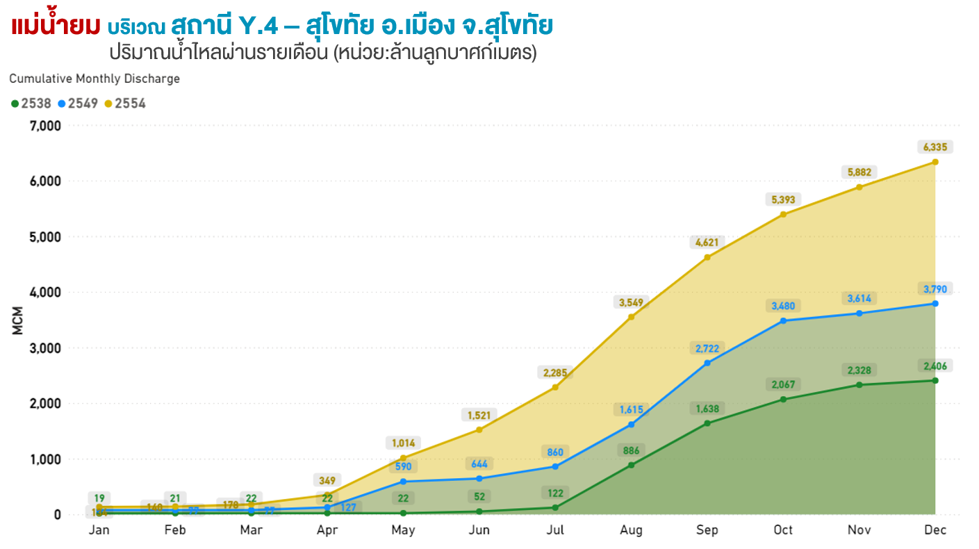 ปี 2554 แม่น้ำยมบริเวณเมืองสุโขทัยมีปริมาณน้ำมากกว่าปี 2538 และ 2549 เกือบทุกเดือน โดยมีน้ำมากที่สุดในเดือนสิงหาคม ปริมาณน้ำรวมทั้งปี 6,335 ล้านลูกบาศก์เมตร มากกว่าปี 2538 และ