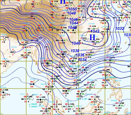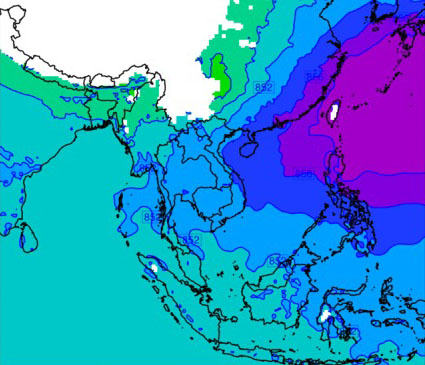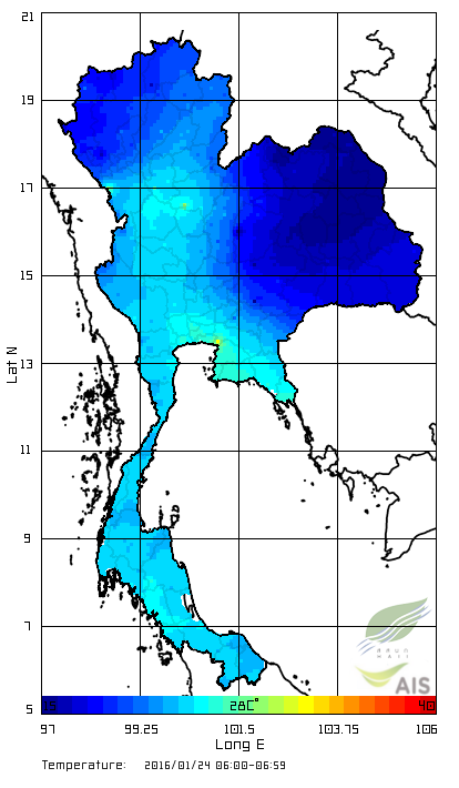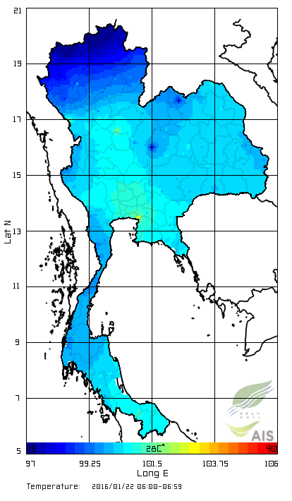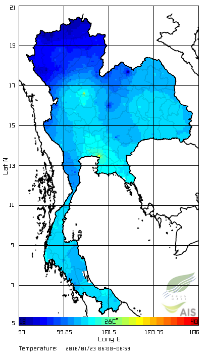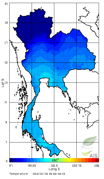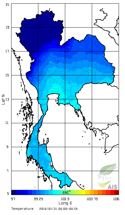 จากแผนที่การกระจายตัวของอุณหภูมิเฉลี่ยเวลา 6.00 น. ตั้งแต่วันที่ 22-31 มกราคม 2559 พบว่าอิทธิพลของหย่อมความกดอากาศสูงส่งผลให้อุณหภูมิลดต่ำลงอย่างชัดเจน