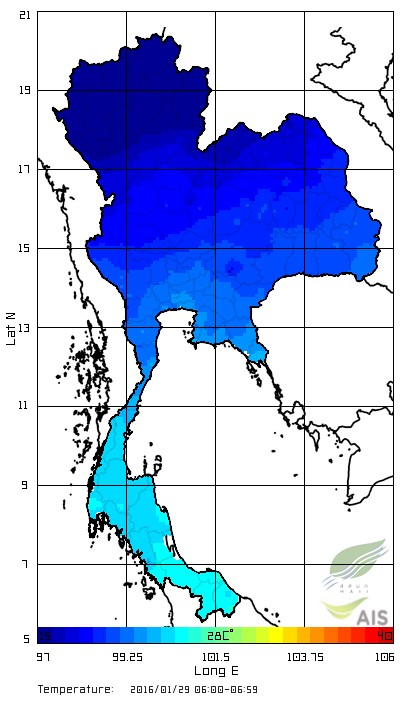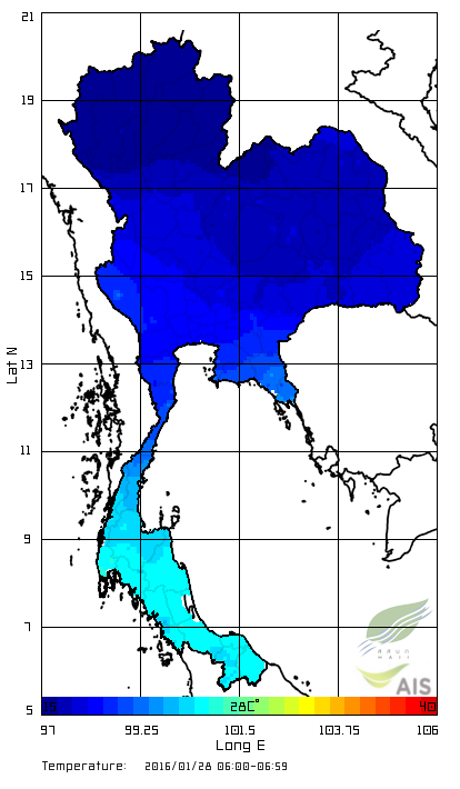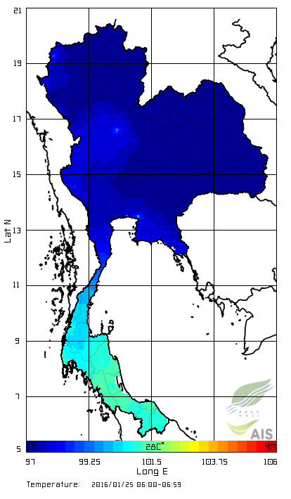 ตอนบนของภาคใต้ และอุณหภูมิยังคงลดลงต่อเนื่องจนถึงวันที่ 26 มกราคม 2559 ต่อมาในวันที่ 27 มกราคม 2559 พื้นที่ภาคใต้ตอนบน ภาคกลางและภาคตะวันออก เริ่มมีอุณหภูมิ