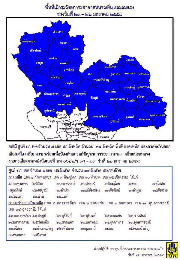 เมื่อวันที่ 23 ม.ค. นายฉัตรชัย พรหมเลิศ อธิบดีกรมป้องกันและบรรเทาสาธารณภัย (ปภ.) ออกหนังสือด่วนที่สุดไปยังผู้ว่าราชการจังหวัด 37 จังหวัด ได้แก่ นครราชสีมา ชัยภูมิ สุรินทร์ บุรีรัมย์ ขอนแก่น มหาสารคาม ร้อยเอ็ด กาฬสินธุ์ สกลนคร นครพนม บึงกาฬ มุกดาหาร อุดรธานี หนองคาย เลย หนองบัวลำภู อุบลราชธานี อำนาจเจริญ ศรีสะเกษ ยโสธร กำแพงเพชร พิจิตร นครสวรรค์ อุทัยธานี พิษณุโลก ตาก สุโขทัย เพชรบูรณ์ อุตรดิตถ์ ลำปาง เชียงใหม่ ลำพูน แม่ฮ่องสอน เชียงราย น่าน พะเยา และแพร่ ระบุว่า กรมอุตุนิยมวิทยาประกาศเตือนเรื่องอากาศแปรปรวนบริเวณประเทศไทยตอนบน ระหว่างวันที่ 23-26 ม.ค. นี้ บริเวณความกดอากาศสูงหรือมวลอากาศเย็นกำลังแรงจากประเทศจีน จะแผ่ลงมาปกคลุมประเทศไทยตอนบน ทำให้มีอากาศแปรปรวน ฝนฟ้าคะนองในระยะแรก จากนั้นอุณหภูมิจะลดอย่างรวดเร็ว 6-10 องศา ขอให้จังหวัดเตรียมการป้องกัน แก้ไขปัญหาและดำเนินการดังนี้ 1.แจ้งเตือนประชาชนที่อาศัยอยู่บนพื้นที่สูง และพื้นที่เสี่ยงภัย เตรียมป้องกันและระมัดระวังอันตรายจากภัยธรรมชาติ โดยประชาสัมพันธ์ผ่านทางวิทยุกระจายเสียงประจำท้องถิ่น