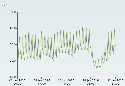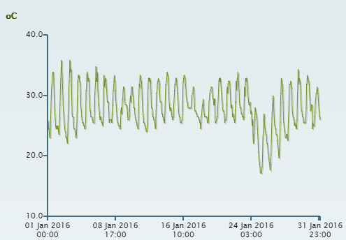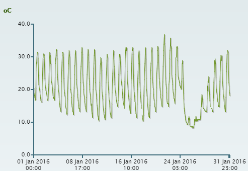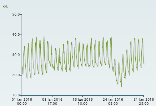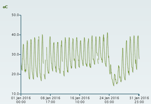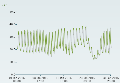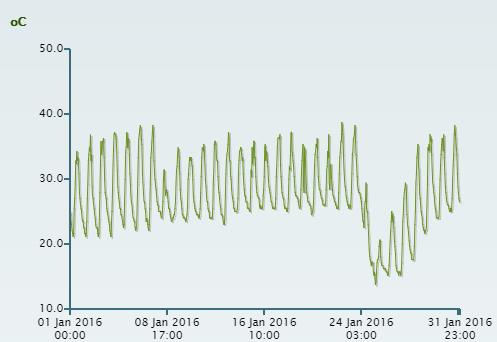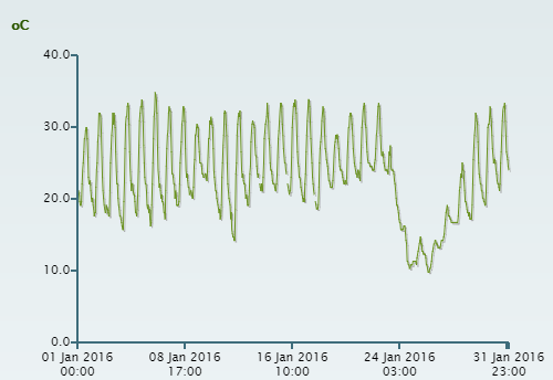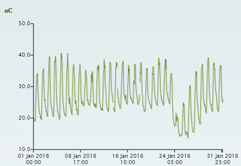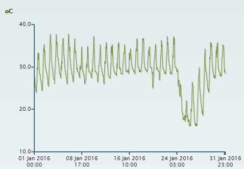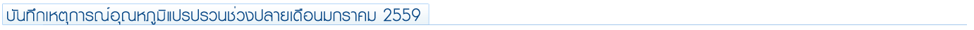 จากการตรวจวัดอุณหภูมิผ่านระบบโทรมาตร พบว่าอุณหภูมิเริ่มลดต่ำลงตั้งแต่วันที่ 23 มกราคม 2559 และลดลงต่ำมากช่วงวันที่ 24-26 มกราคม 2559