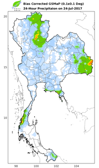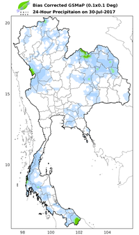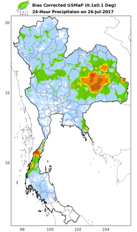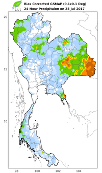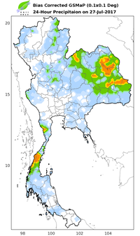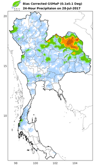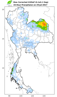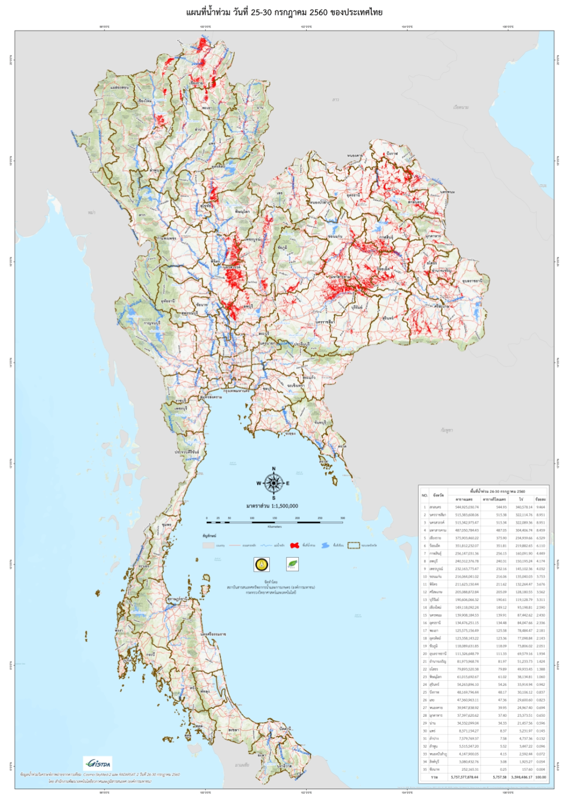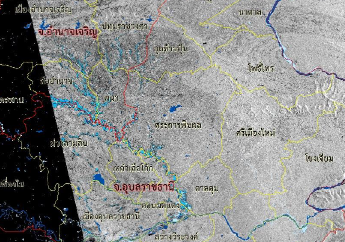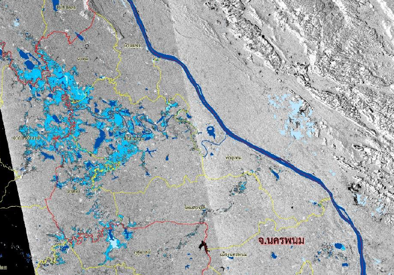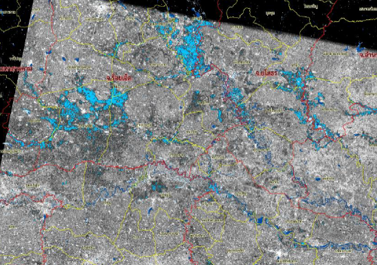 ดาวเทียม COSMO-SkyMed-2 RADARSAT-2 ได้บันทึกภาพบริเวณประเทศไทย ช่วงวันที่ 25-30 ก.ค. 60 และจากการวิเคราะห์ภาพจากดาวเทียมพบพื้นที่ถูกน้ำท่วมทั้งสิ้น 35 จังหวัด ประกอบด้วย