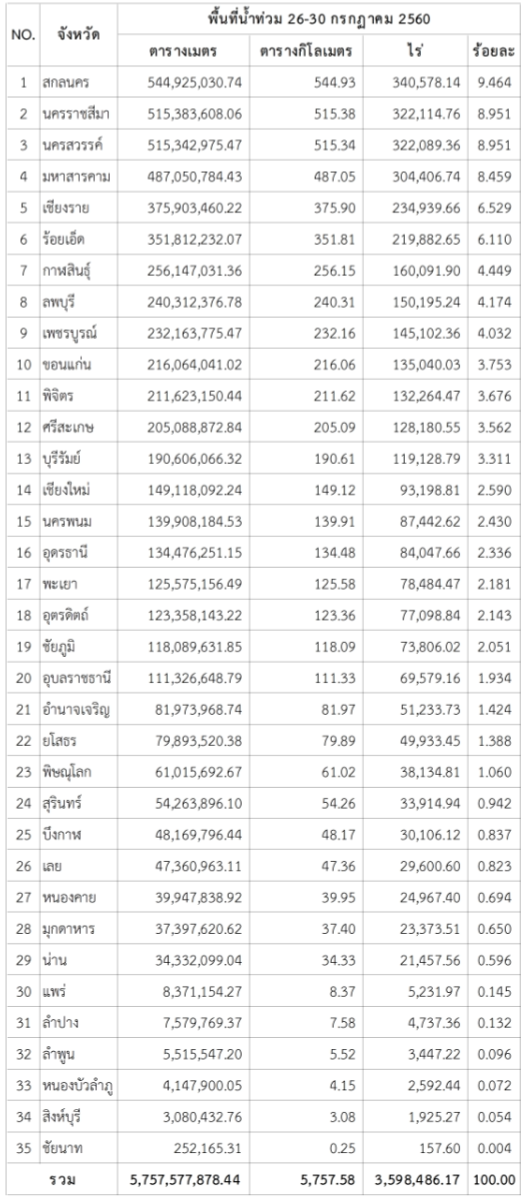 รวมพื้นที่ถูกน้ำท่วมประมาณ 3.6 ล้านไร่ โดยจังหวัดสกลนครมีพื้นที่ถูกน้ำท่วมมากที่สุด 340,578 ไร่ รองลงมาคือจังหวัดนครราชสีมา 322,145 ไร่ และนครสวรรค์ 322,089 ไร่ รายละเอียดเพิ่มเติมดังตารางและแผนที่ด้านล่าง