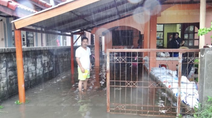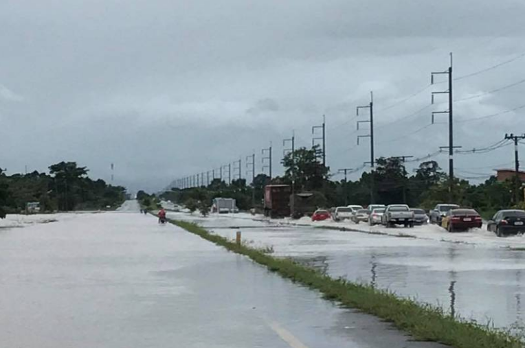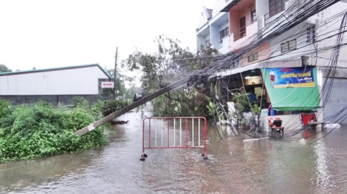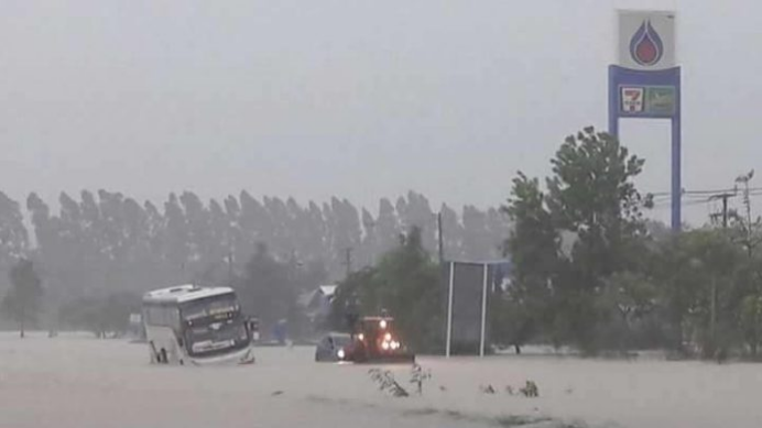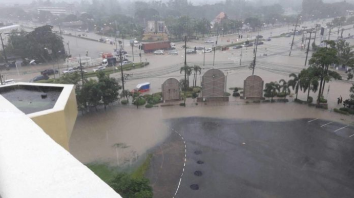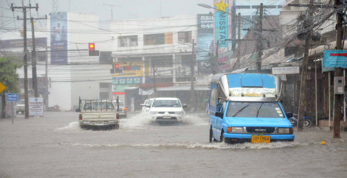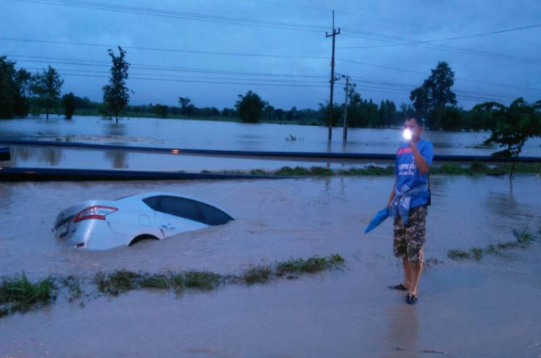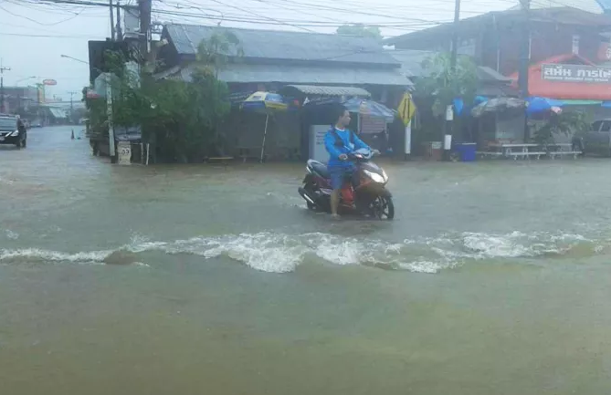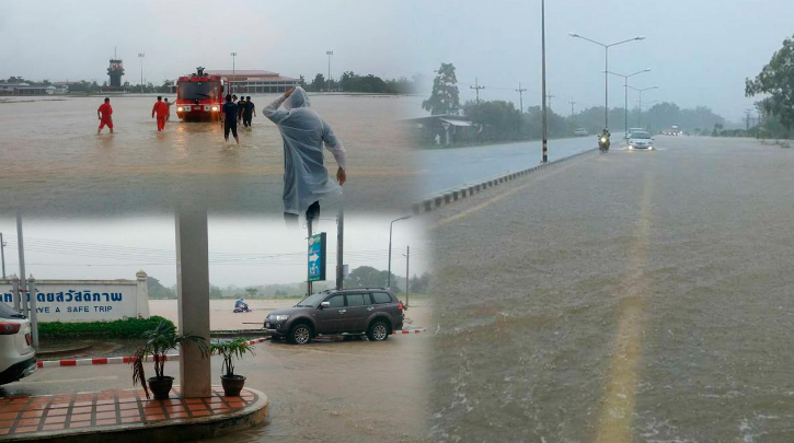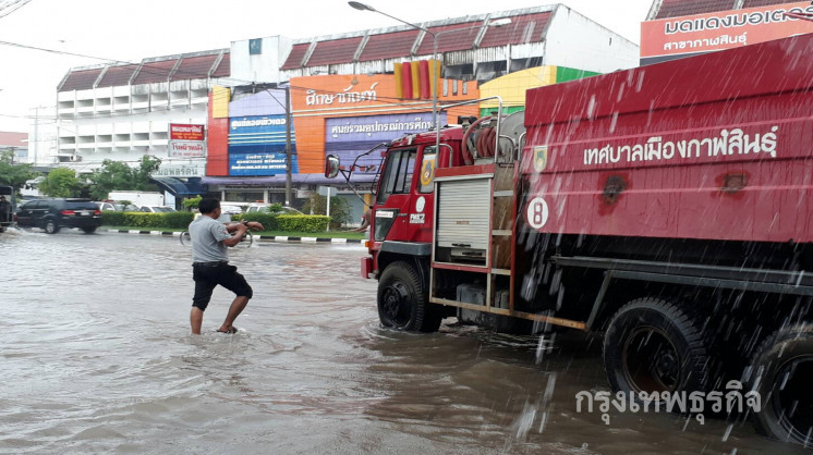 พายุฝนเซินกาถล่มเมืองกาฬสินธุ์ ถนนหลายสายถูกน้ำท่วมขังสูง ทำให้รถเล็กสัญจรผ่านไปมายากลำบาก