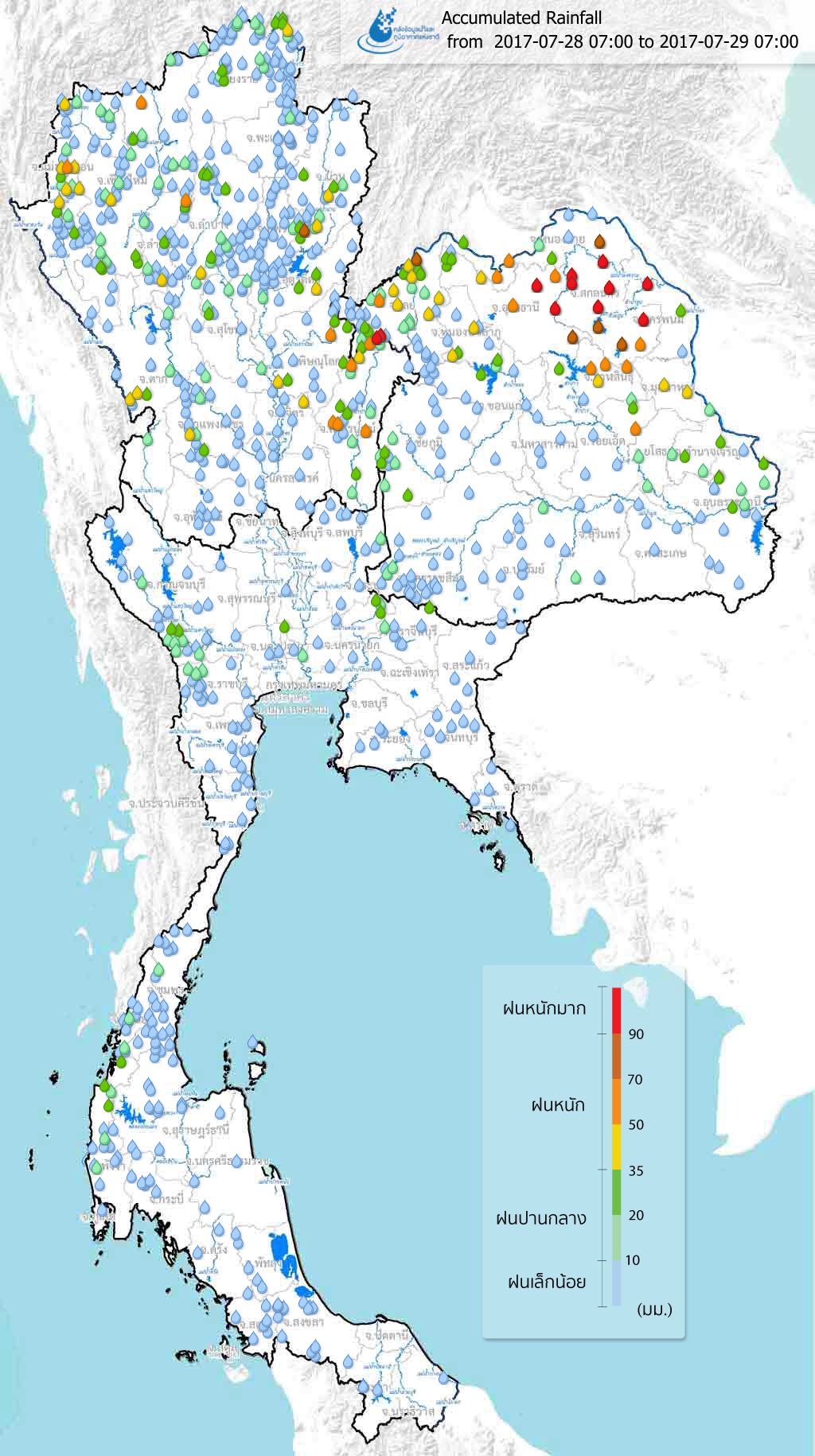 ข้อมูลจากรายงานสถานการณ์สาธารณภัยของกรมป้องกันและบรรเทาสาธารณภัยประจำวันที่ 10 สิงหาคม 2560 เวลา 07.00 น. ได้รายงานสถานการณ์ฝนตกหนักทำให้เกิดอุทกภัยและน้ำไหลหลากท่วมขังในพื้นที่ 44 จังหวัด ประกอบด้วย ภาคเหนือ 13 จังหวัด ได้แก่ จังหวัดเพชรบูรณ์ น่าน กำแพงเพชร เชียงราย เชียงใหม่ พิจิตร อุตรดิตถ์ พะเยา พิษณุโลก แพร่ แม่ฮ่องสอน ลำปาง สุโขทัย ภาคตะวันออกเฉียงเหนือ 18 จังหวัด ได้แก่ ชัยภูมิ เลย อุบลราชธานี ขอนแก่น มหาสารคาม ศรีสะเกษ นครราชสีมา กาฬสินธุ์ บุรีรัมย์ สกลนคร มุกดาหาร อำนาจเจริญ ร้อยเอ็ด อุดรธานี ยโสธร หนองคาย นครพนม สุรินทร์ ภาคกลาง 8 จังหวัด ได้แก่ จังหวัดนครสวรรค์ ชัยนาท พระนครศรีอยุธยา อุทัยธานี อ่างทอง นนทบุรี สระบุรี ลพบุรี ภาคตะวันออก 2 จังหวัด ได้แก่ จังหวัดจันทบุรีและตราด ภาคใต้ 3 จังหวัด ได้แก่ จังหวัดระนอง ประจวบคีรีขันธ์ ชุมพร รวม 300 อำเภอ 1,651 ตำบล 13,191 หมู่บ้าน 43 ชุมชน ประชาชนได้รับผลกระทบ 580,352 ครัวเรือน 1,845,956 คน มีผู้เสียชีวิต 29 ราย ประกอบด้วย จังหวัดสกลนคร 11 ราย มหาสารคาม 4 ราย ร้อยเอ็ด 4 ราย มุกดาหาร 2 ราย อุดรธานี 2 ราย ศรีสะเกษ 3 ราย ขอนแก่น 2 ราย อุบลราชธานี 1 ราย ความเสียหายด้านสิ่งสาธารณประโยชน์ บ้านเรือนได้รับผลกระทบ 4,129 หลัง ถนน 2,055 จุด คอสะพาน 43 แห่ง สะพาน 177 แห่ง โรงเรียน 131 แห่ง วัด 39 แห่ง สถานที่ราชการ 7 แห่ง ฝ่าย/ทำนบ 8,704 แห่ง บ่อปลา 14,097 บ่อ ปศุสัตว์ 738,860 ตัว พื้นที่ที่ได้รับผลกระทบด้านการเกษตร 3,036,310 ไร่