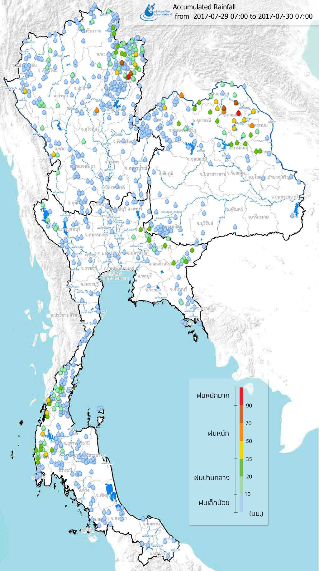รายงานข้อมูลปริมาณฝนสะสมรายวันจากคลังข้อมูลน้ำและภูมิอากาศแห่งชาติ ในช่วงวันที่ 24-31 ก.ค. 60 พบฝนตกหนักถึงหนักมากกระจุกตัวอยู่ในทุกภาคของประเทศ โดยในวันที่ 23 ก.ค. 60 มีฝนตกหนักกระจุกตัวอยู่บริเวณภาคเหนือตอนบน บริเวณกรุงเทพมนคนครและปริมณฑล ต่อมาในวันที่ 24 ก.ค. 60 ยังคงมีฝนตกหนักบริเวณภาคเหนือ และในวันนี้ประเทศไทยเริ่มได้รับอิทธิพลจากพายุ "เซินกา" (SONCA) ทำให้ภาคตะวันออกเฉียงเหนือเริ่มมีฝนตกหนักทางด้านตะวันออกของภาค และอิทธิพลของพายุยังทำให้มรสุมตะวันตกเฉียงใต้ที่พัดปกคลุมทะเลอันดามันและประเทศไทยมีกำลังแรง ส่งผลทำให้ด้านตะวันตกของภาคใต้และภาคตะวันออกมีฝนหนักในบางพื้นที่ ต่อมาในช่วงวันที่ 25-28 ก.ค. 60 ซึ่งเป็นช่วงที่พายุเคลื่อนตัวเข้าสู่ประเทศไทย ส่งผลให้มีฝนตกหนักกระจายในพื้นที่ภาคตะวันออกเฉียงเหนือและภาคเหนือ ส่วนภาคใต้และภาคตะวันออกยังคงมีฝนตกหนักต่อเนื่องเช่นกัน และในช่วงวันที่ 29-30 ก.ค. 60 ปริมาณฝนเริ่มลดลงในทุกพื้นที่ สำหรับจังหวัดที่มีฝนตกหนักมาก ปริมาณฝนสะสมเกิน 90 มิลลิเมตรต่อวัน ได้แก่ จังหวัดอุบลราชธานี ขอนแก่น มหาสารคาม ร้อยเอ็ด อำนาจเจริญ นครราชสีมา ยโสธร กาฬสินธุ์ ชัยภูมิ สกลนคร มุกดาหาร อุดรธานี นครพนม น่าน เชียงราย แพร่ ลำปาง เพชรบูรณ์ กำแพงเพชร สุราษฎร์ธานี พังงา ระนอง ชุมพร ปัตตานี สตูล และตราด รายละเอียดเพิ่มเติม ดังแผนที่และตารางด้านล่าง