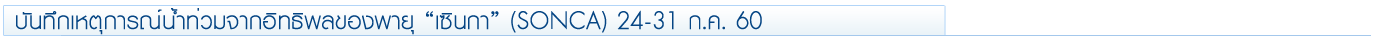 สถานการณ์น้ำท่วมจากอิทธิพลของพายุ "ตาลัส" (TALAS) ยังไม่เข้าสู่สภาวะปกติ พายุโซนร้อน "เซินกา" (SONCA) ซึ่งเป็นพายุลูกที่ 2 ได้เคลื่อนตัวเข้าสู่ประเทศไทยในช่วงปลายเดือน ส่งผลทำให้เกิดฝนตกหนักต่อเนื่องในหลายพื้นที่ โดยเฉพาะภาคตะวันออกเฉียงเหนือและบางพื้นที่ของภาคเหนือ โดยอิทธิพลของพายุเริ่มส่งผลทำให้เกิดฝนตกหนักบริเวณด้านตะวันออกตอนล่างของภาคตะวันออกเฉียงเหนือ ในช่วงวันที่ 24 ก.ค. 60 หลังจากนั้นสถานการณ์ฝนตกหนักเริ่มแผ่กว้างไปถึงตอนกลางของภาค และกระจายสู่ตอนบนของภาคในช่วงวันที่ 28-29 ก.ค. 60 นอกจากนี้อิทธิพลของพายุยังส่งผลทำให้มรสุมตะวันตกเฉียงใต้ที่พัดปกคลุมทะเลอันดามัน ประเทศไทย และอ่าวไทยมีกำลังแรงขึ้น ส่งผลทำให้เกิดฝนตกหนักในพื้นที่รับลม ได้แก่ ด้านตะวันตกของภาคใต้บริเวณจังหวัดชุมพร ระนอง พังงา สุราษฎร์ธานี และภาคตะวันออกบริเวณจังหวัดจันทบุรีและตราด
