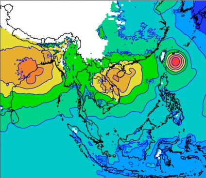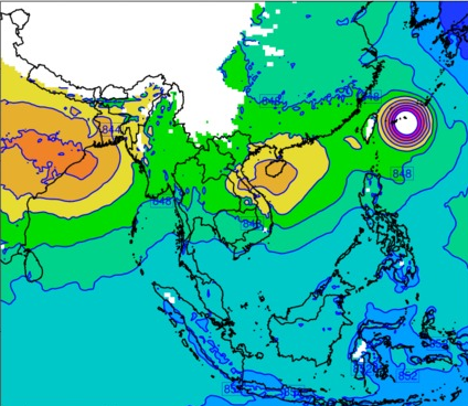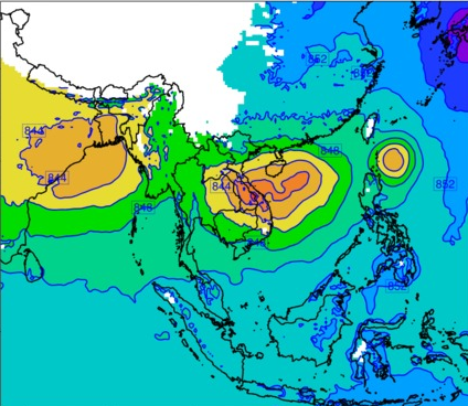 แผนที่แสดงความกดอากาศที่ระดับความสูง 1.5 กิโลเมตรจากระดับน้ำทะเล แสดงให้เห็นถึงการเคลื่อนตัวของพายุโซนร้อน "โพดุล" ซึ่งในวันที่ 28 สิงหาคม 2562 พายุดังกล่าวได้เคลื่อนตัวอยู่บริเวณทะเลจีนใต้ตอนบน (พื้นที่วงกลมสีเหลืองและสีส้ม) ค่าความกดอากาศอยู่ที่ประมาณ 840-846 hPa ซึ่งหลังจากนั้นพายุดังกล่าวได้เคลื่อนตัวไปทางทิศตะวันตกอย่างต่อเนื่องและเข้าสู่ประเทศไทยในวันที่ 30 สิงหาคม 2562 ซึ่งจะเห็นได้ว่าบริเวณความกดอากาศต่ำครอบคลุมพื้นที่กว้างมากยิ่งขึ้น (พื้นที่สีเหลือง ส้ม แดง) ค่าความกดอากาศอยู่ที่ประมาณ 838-846 hPa และในวันต่อมาบริเวณสีส้มและสีแดงได้หายไป โดยบริเวณตอนบนประเทศไทยเหลือเพียงสีเหลืองและสีเหลืองแก่ ค่าความกดอากาศอยู่ที่ประมาณ 842-846 hPa ต่อมาในวันที่ 1 กันยายน 2562 ค่าความกดอากาศได้กลับสู่สภาวะปกติเหลืออยู่ที่ประมาณ 846-850 hPa (บริเวณประเทศไทยเป็นสีเขียว) ทั้งนี้ในวันเดียวกันนี้ จะเห็นได้ว่ามีพายุดีเปรสชันก่อตัวขึ้นบริเวณทะเลจีนใต้ตอนบนทางตอนเหนือของประเทศฟิลิปปินส์ (วงกลมสีเหลือง) หลังจากนั้นพายุดีเปรสชันได้เคลื่อนตัวไปทางทิศตะวันตกพร้อมกับเพิ่มกำลังแรงขึ้นเป็นพายุโซนร้อน “คาจิกิ” (KAJIKI) ในวันที่ 2 กันยายน 2562 (วงกลมสีเหลืองเข้มและสีเหลืองอ่อนบริเวณอ่าวตังเกี๋ย) ค่าความกดอากาศอยู่ที่ประมาณ 840-846 hPa หลังจากนั้นได้เคลื่อนตัวผ่านประเทศเวียดนามเข้าประเทศลาว ในวันที่ 3 กันยายน 2562 และเคลื่อนตัวย้อนกลับไปยังประเทศเวียดนามอีกครั้งพร้อมลดกำลังลงเป็นพายุดีเปรสชัน ก่อนสลายตัวไปกลายเป็นหย่อมความกดอากาศต่ำในวันที่ 4 กันยายน 2562 และค่าความกดอากาศเหลือประมาณ 844-846 hPa