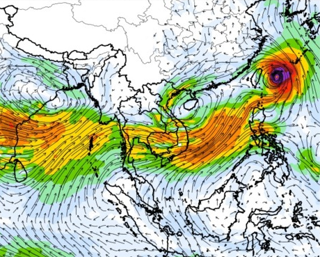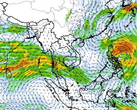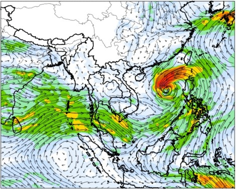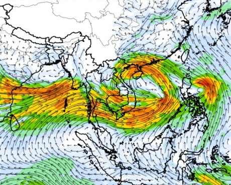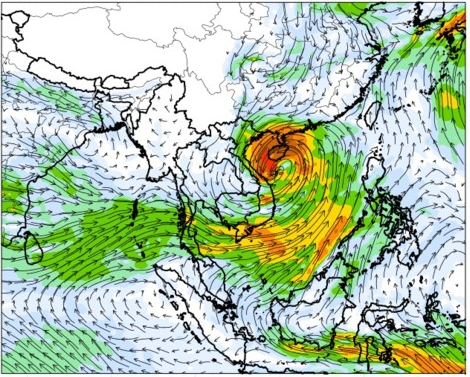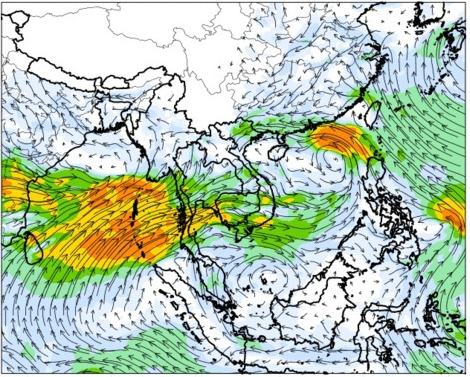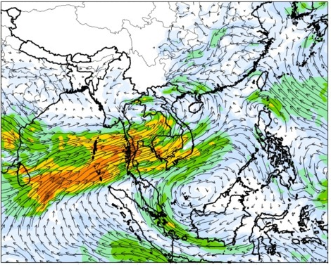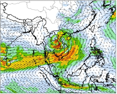 แผนที่ความเร็วลม จากแบบจำลองสภาพอากาศ WRF-ROMS