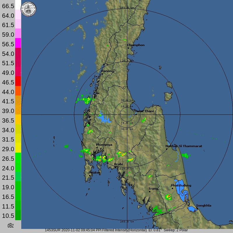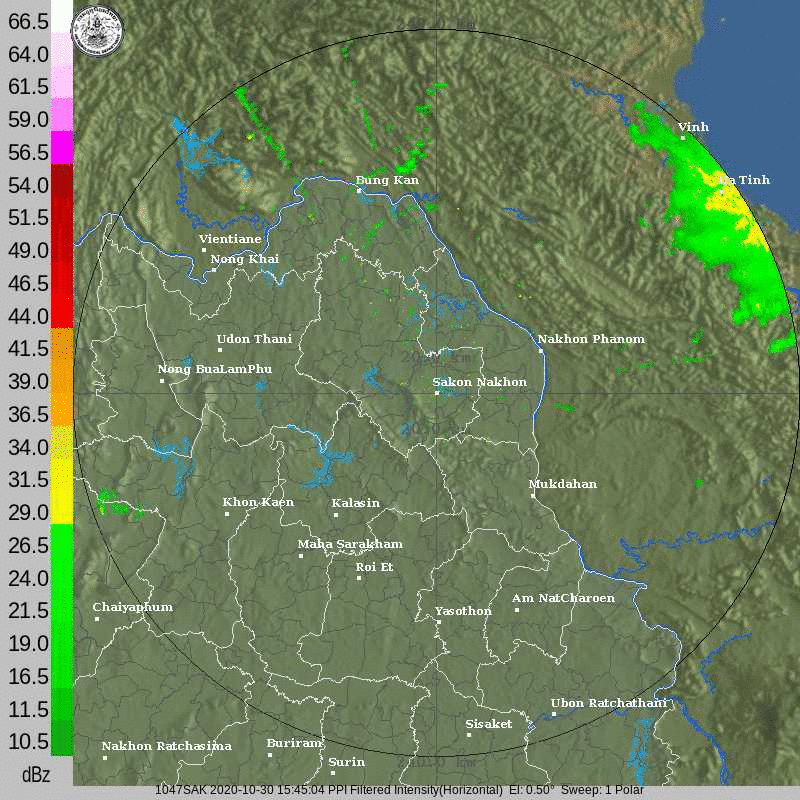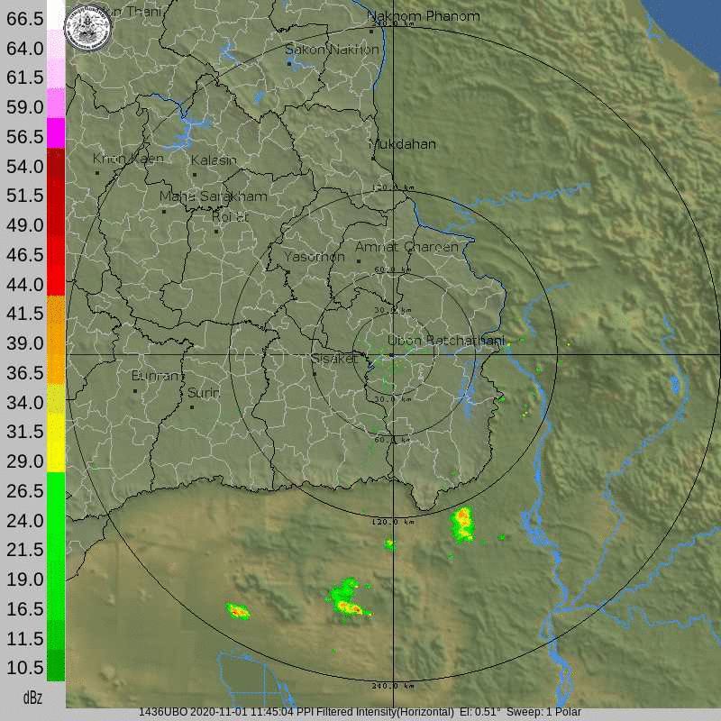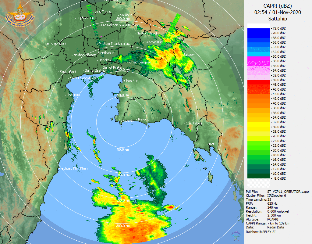 ภาพจากเรดาร์ตรวจวัดปริมาณฝนของกรมอุตุนิยมวิทยา และกรมฝนหลวงและการบินเกษตร ได้แก่ เรดาร์สกลนคร อุบลราชธานี ขอนแก่น พิมายและสัตหีบ แสดงให้เห็นว่ากลุ่มฝนที่เกิดจากอิทธิพลของพายุไต้ฝุ่น “โมลาเบ” (MOLAVE) เริ่มเพิ่มขึ้นอย่างเห็นได้ชัดในบริเวณภาคตะวันออกเฉียงเหนือ ตั้งแต่วันที่ 28 ตุลาคม 2563 ซึ่งขณะนั้นพายุยังไม่ได้เคลื่อนเข้าสู่ประเทศไทย หลังจากนั้นกลุ่มฝนได้กระจายตัวเพิ่มขึ้นในวันที่ 29 ตุลาคม 2563 ครอบคลุมทั้งภาคตะวันออกเฉียงเหนือ ภาคกลาง ภาคตะวันออก นอกจากนี้ หลังจากที่พายุได้สลายตัว