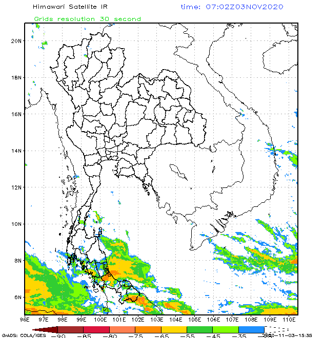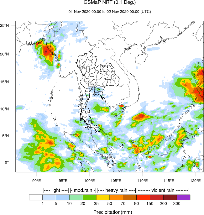 แผนภาพแสดงปริมาณฝนสะสมรายวันจาก GSMaP แสดงให้เห็นว่าอิทธิพลจากพายุ "โมลาเบ" (MOLAVE) ส่งผลทำให้มีฝนตกหนักบริเวณภาคตะวันออกเฉียงเหนือ ในวันที่ 28 ตุลาคม 2563 หลังจากนั้นกลุ่มฝนได้กระจายตัวเพิ่มมากขึ้น