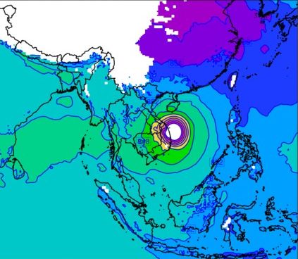 แผนที่แสดงความกดอากาศที่ระดับความสูง 1.5 กิโลเมตรจากระดับน้ำทะเล แสดงให้เห็นถึงการเคลื่อนตัวของพายุไต้ฝุ่น "โมลาเบ" โดยในวันที่ 26 ตุลาคม 2563 พายุดังกล่าวได้ทวีกำลังแรงขึ้นเป็นพายุไต้ฝุ่นระดับ 2 หลังจากเคลื่อนตัวลงทะเลจีนใต้ (พื้นที่วงกลมสีแดง) ค่าความกดอากาศต่ำสุดอยู่ที่ประมาณ 838-840 hPa ซึ่งหลังจากนั้นพายุ