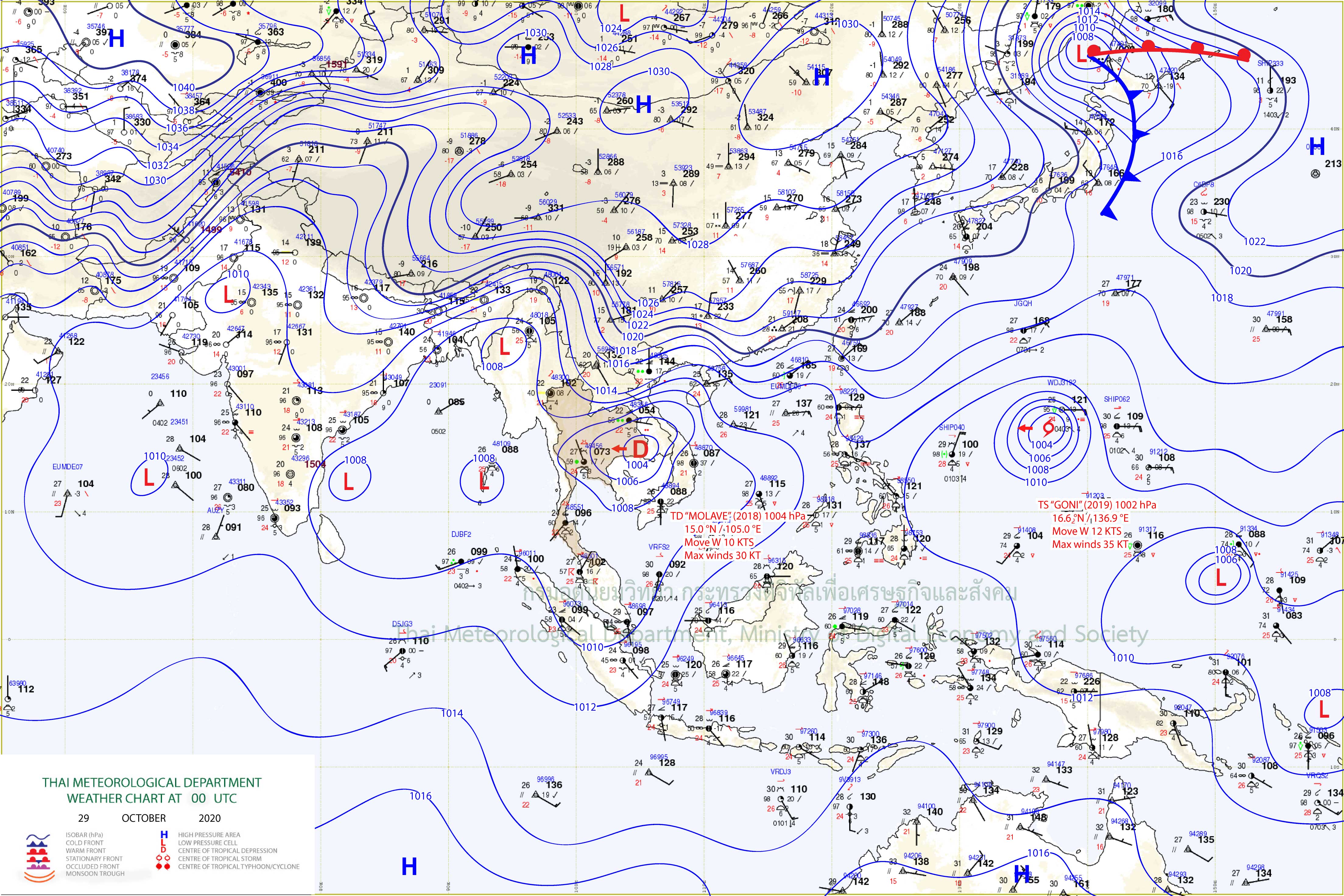 ) ก่อนเข้าตัวเข้าประเทศไทยในวันที่ 29 ตุลาคม 2563 แล้วสลายตัวกลายเป็นหย่อมความกดอากาศต่ำ (สัญลักษณ์