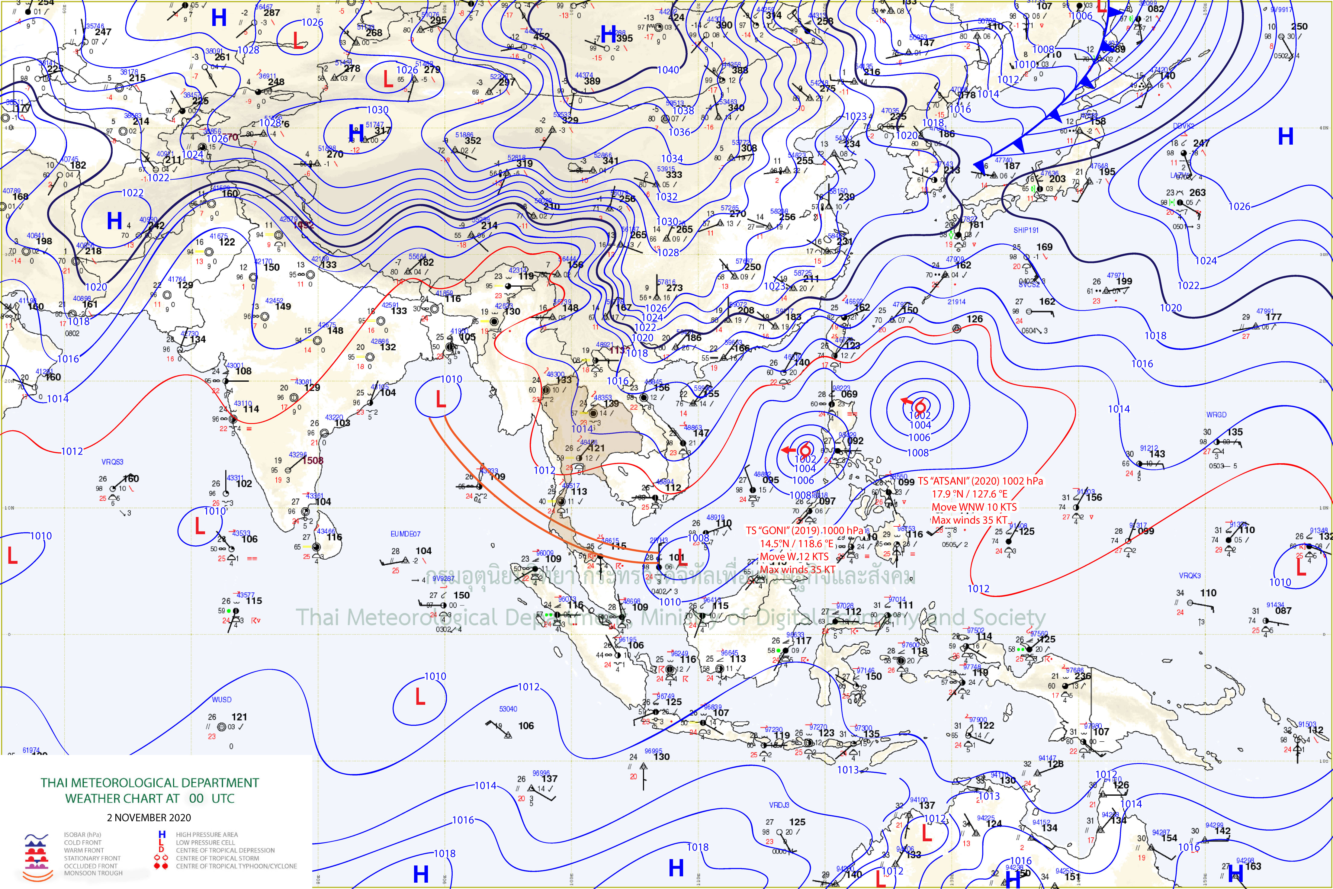 กำลังค่อนข้างแรง ประกอบกับความกดอากาศสูงจากประเทศจีนได้แผ่ลงมาปกคลุมบริเวณภาคเหนือและภาคตะวันออกเฉียงเหนือตอนบน ทำให้เกิดแนวปะทะของมวลอากาศเย็นและอากาศร้อน (เส้น Isobar สีแดง หมายเลข 1012