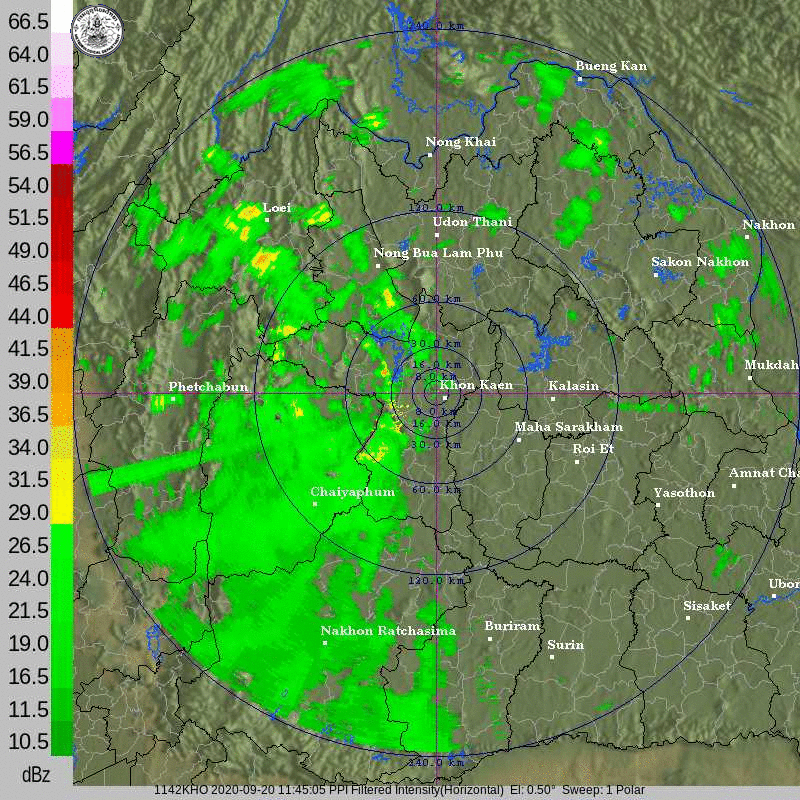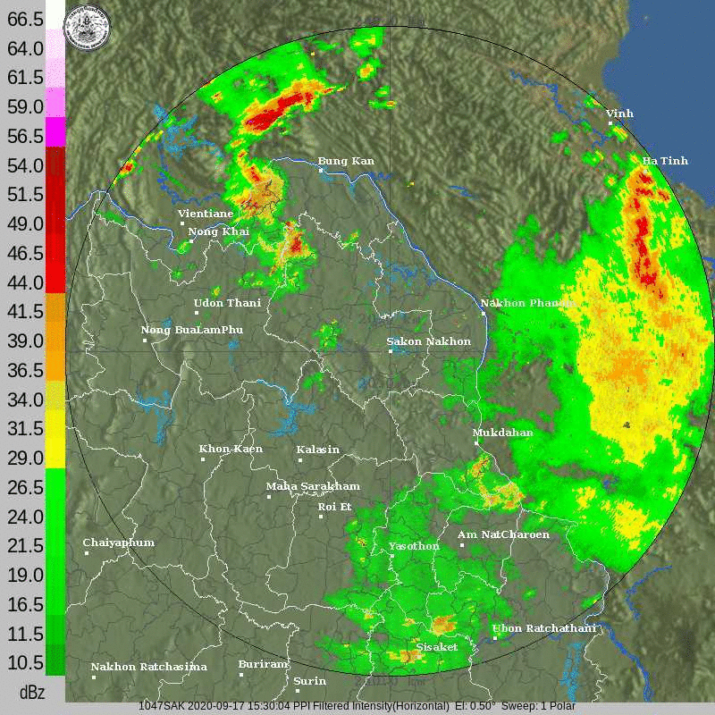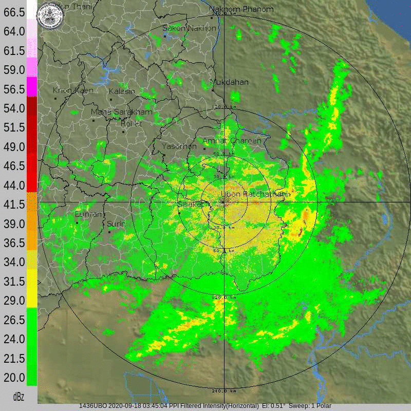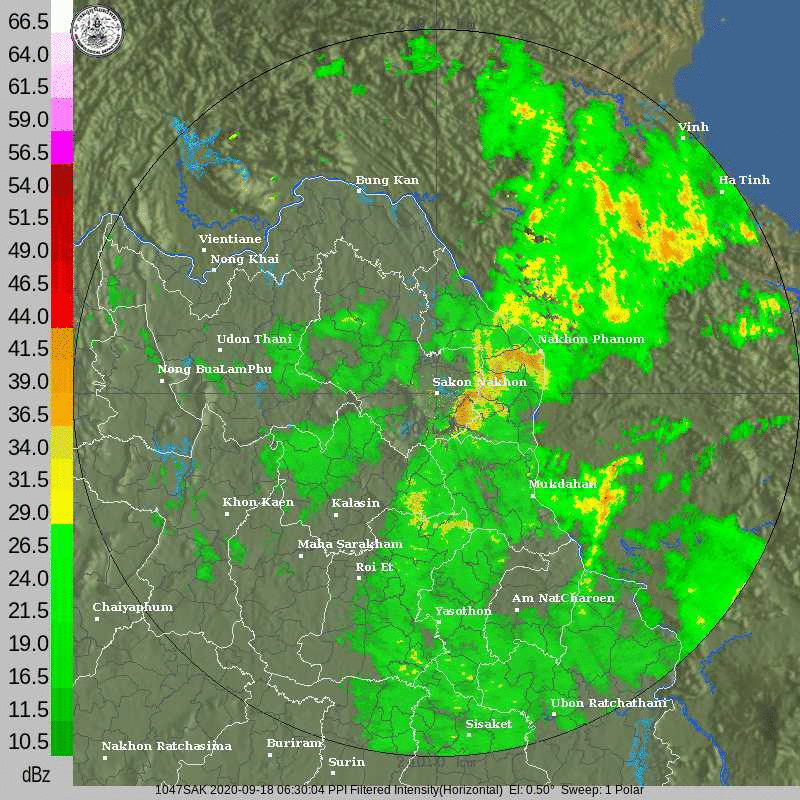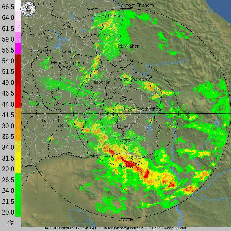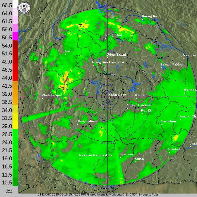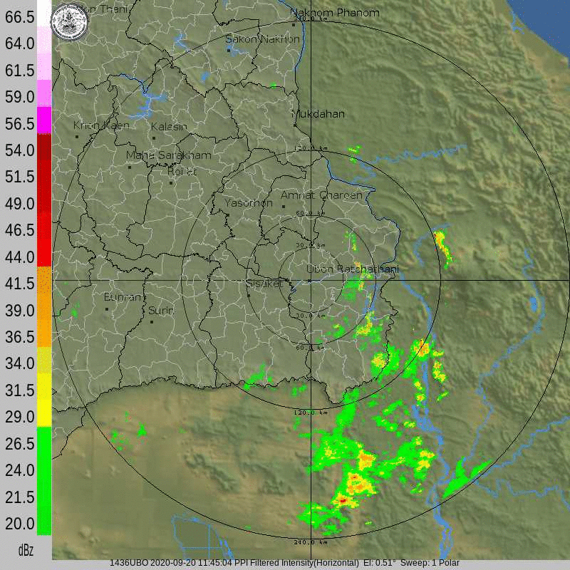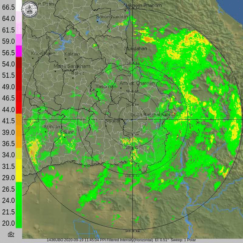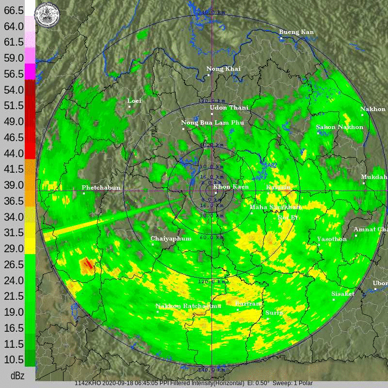 ภาพจากเรดาร์ตรวจวัดปริมาณฝนของกรมอุตุนิยมวิทยา และกรมฝนหลวงและการบินเกษตร ได้แก่ เรดาร์สกลนคร อุบลราชธานี ขอนแก่น พิษณุโลก สัตหีบ แสดงให้เห็นว่ากลุ่มฝนที่เกิดจากอิทธิพลของพายุโซนร้อน “โนอึล” (NOUL) เริ่มเพิ่มขึ้นอย่างเห็นได้ชัดในบริเวณภาคตะวันออกเฉียงเหนือ ตั้งแต่วันที่ 17 กันยายน 2563 ซึ่งขณะนั้นพายุยังไม่ได้เคลื่อนเข้าสู่ประเทศไทย หลังจากนั้น