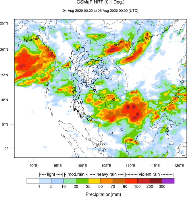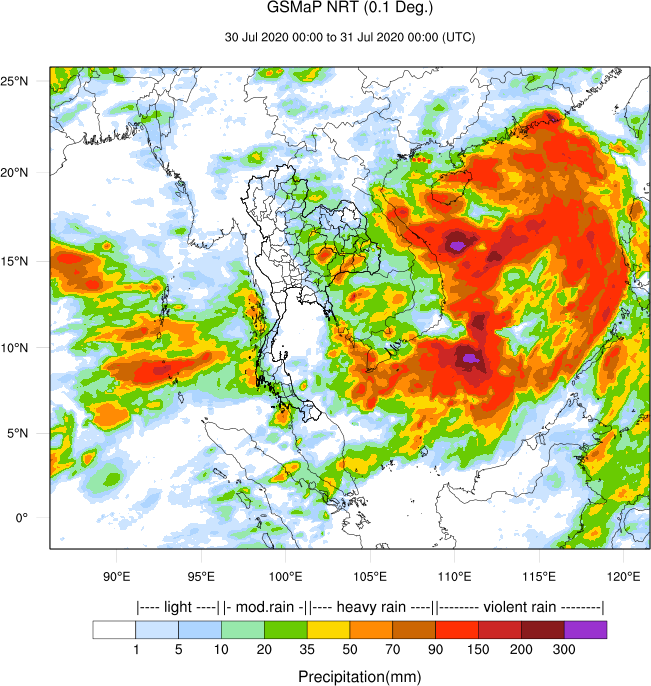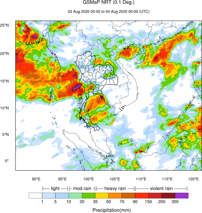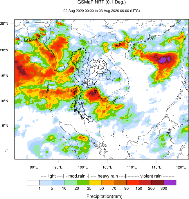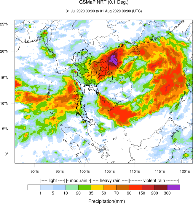 แผนภาพแสดงปริมาณฝนสะสมรายวันจาก GSMaP แสดงให้เห็นว่าอิทธิพลจากพายุ "ซินลากู" ส่งผลทำให้มีฝนตกหนักบริเวณภาคตะวันออกเฉียงเหนือ ในวันที่ 1 สิงหาคม 2563 ต่อเนื่องไปถึงวันที่ 2 สิงหาคม 2563 ส่งผลทำให้เกิดฝนตกหนักและน้ำท่วมในหลาย
