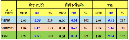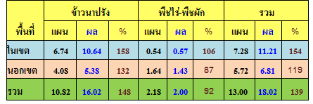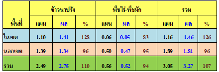 ผลการเพาะปลูกพืชฤดูแล้งทั้งในเขตและนอกเขตพื้นที่ชลประทานของลุ่มน้ำเจ้าพระยา ล่าสุด(ณ 30 ม.ค. 57) พบว่ามีการเพาะปลูกพืชฤดูแล้งไปแล้วกว่า 8.55 ล้านไร่ หรือคิดเป็นร้อยละ 168 ของแผนทั้งหมด(แผนกำหนดไว้ 5.09 ล้านไร่) แยกเป็นพื้นที่ทำนาปรัง 8.29 ล้านไร่ หรือคิดเป็นร้อยละ 175 ของแผน(แผนกำหนดไว้ 4.74 ล้านไร่) และพืชไร่-พืชผัก 0.26 ล้านไร่ หรือคิดเป็นร้อยละ 74 ของแผน(แผนกำหนดไว้ 0.35 ล้านไร่)