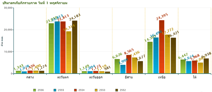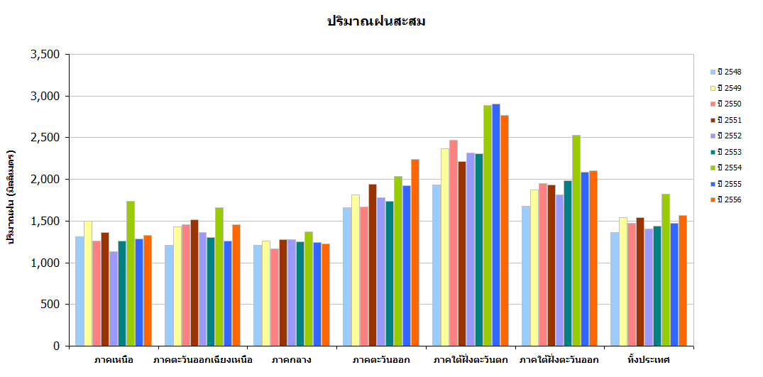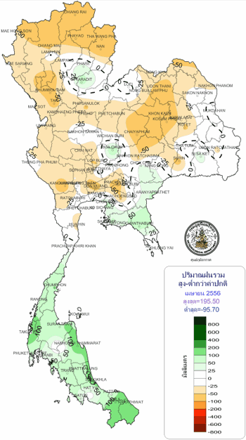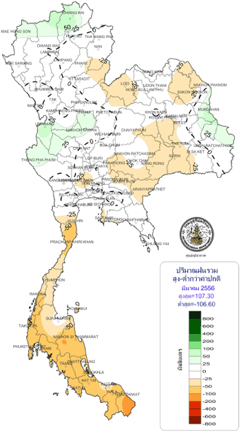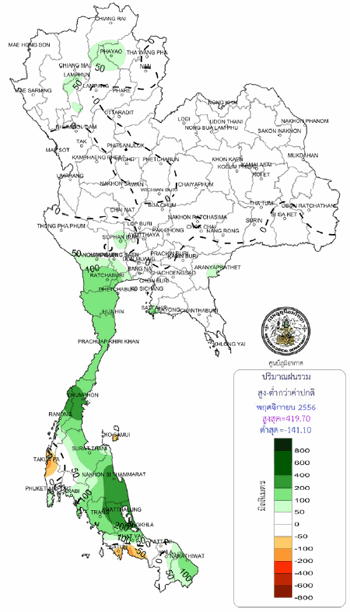 ปี 2556 มีปริมาณฝนสะสมเฉลี่ยทั้งประเทศ 1,569 มิลลิเมตร หรือสูงกว่าค่าเฉลี่ย 14%