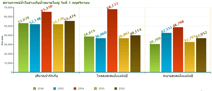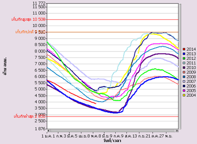 ศูนย์ประมวลวิเคราะห์สถานการณ์น้ำ กรมชลประทาน รายงานสถานการณ์น้ำในอ่างเก็บน้ำขนาดใหญ่ที่เป็นแหล่งน้ำต้นทุน ส่งไปสนับสนุนการใช้น้ำในพื้นที่ลุ่มน้ำเจ้าพระยา(เขื่อนภูมิพล เขื่อนสิริกิติ์ เขื่อนแควน้อยฯ และเขื่อนป่าสักฯ) ล่าสุด(5 ก.พ. 57) มีปริมาณน้ำรวมกัน จำนวน 12,885 ล้านลูกบาศก์เมตร หรือคิดเป็นร้อยละ 52 ของความจุอ่างฯรวมกันทั้งหมด มีปริมาณน้ำที่สามารถนำมาใช้การได้จำนวนทั้งสิ้น 6,189 ล้านลูกบาศก์เมตร