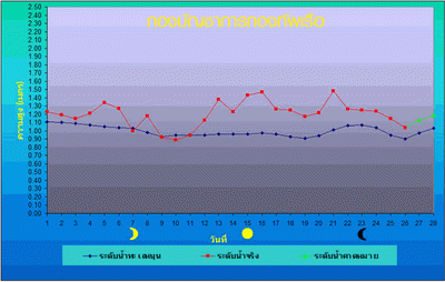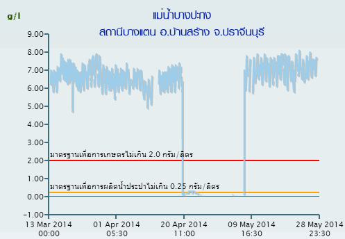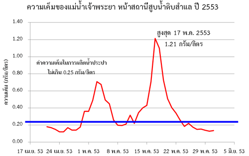 2.บริเวณท่าน้ำนนทบุรี วัดได้ 4.43 กรัม/ลิตร (ระยะทางจากปากอ่าวไทย ถึงสถานีวัดท่าน้ำนนทบุรี ประมาณ 67 กิโลเมตร)