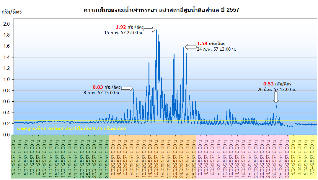 ขณะที่เฟซบุ๊ก ศูนย์ประมวลวิเคราะห์สถานการณ์น้ำ กรมชลประทาน รายงานวันนี้ (20 ก.พ. 57) ค่าความเค็มในแม่น้ำเจ้าพระยา วัดได้ตามจุดต่างๆ ที่สำคัญ ดังนี้