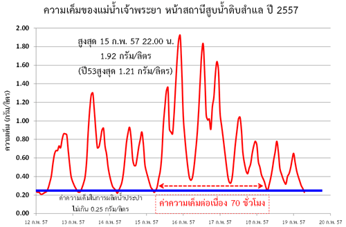 หมายเหตุ - ค่าความเค็มสำหรับการผลิตน้ำประปา จะต้องไม่เกินค่ามาตรฐานที่ 0.25 กรัม/ลิตร